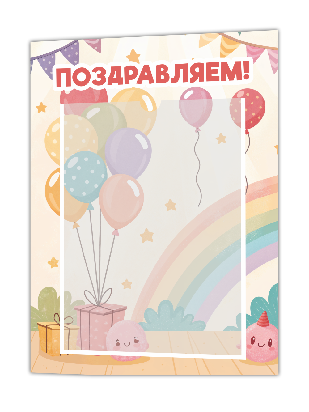 Яркий и доброжелательный стенд «Поздравляем!» — отличное решение для оформления группы в детском саду, класса в школе или детского центра. Милый дизайн с шариками, подарками и радугой создаёт атмосферу праздника и радости. В прозрачный карман можно разместить поздравления, фото именинников или детские рисунки.