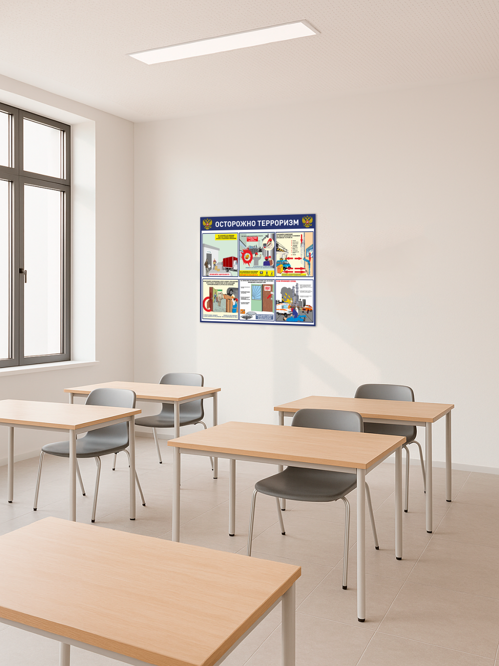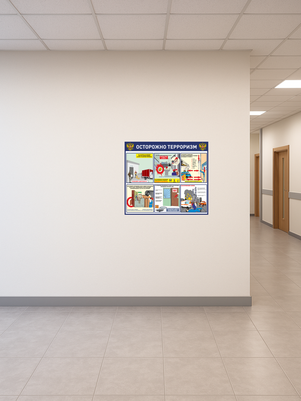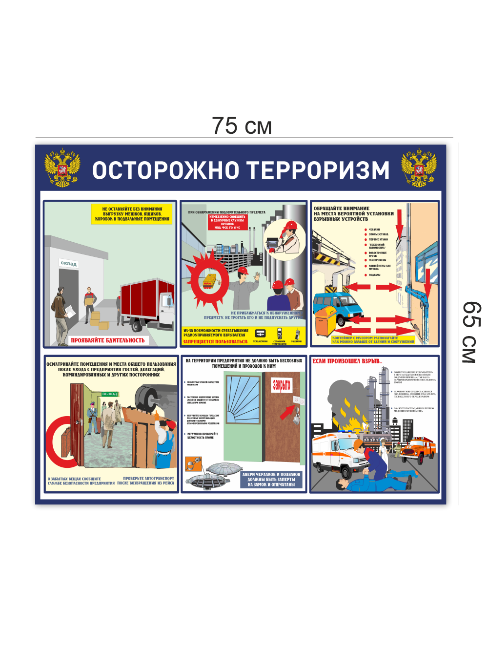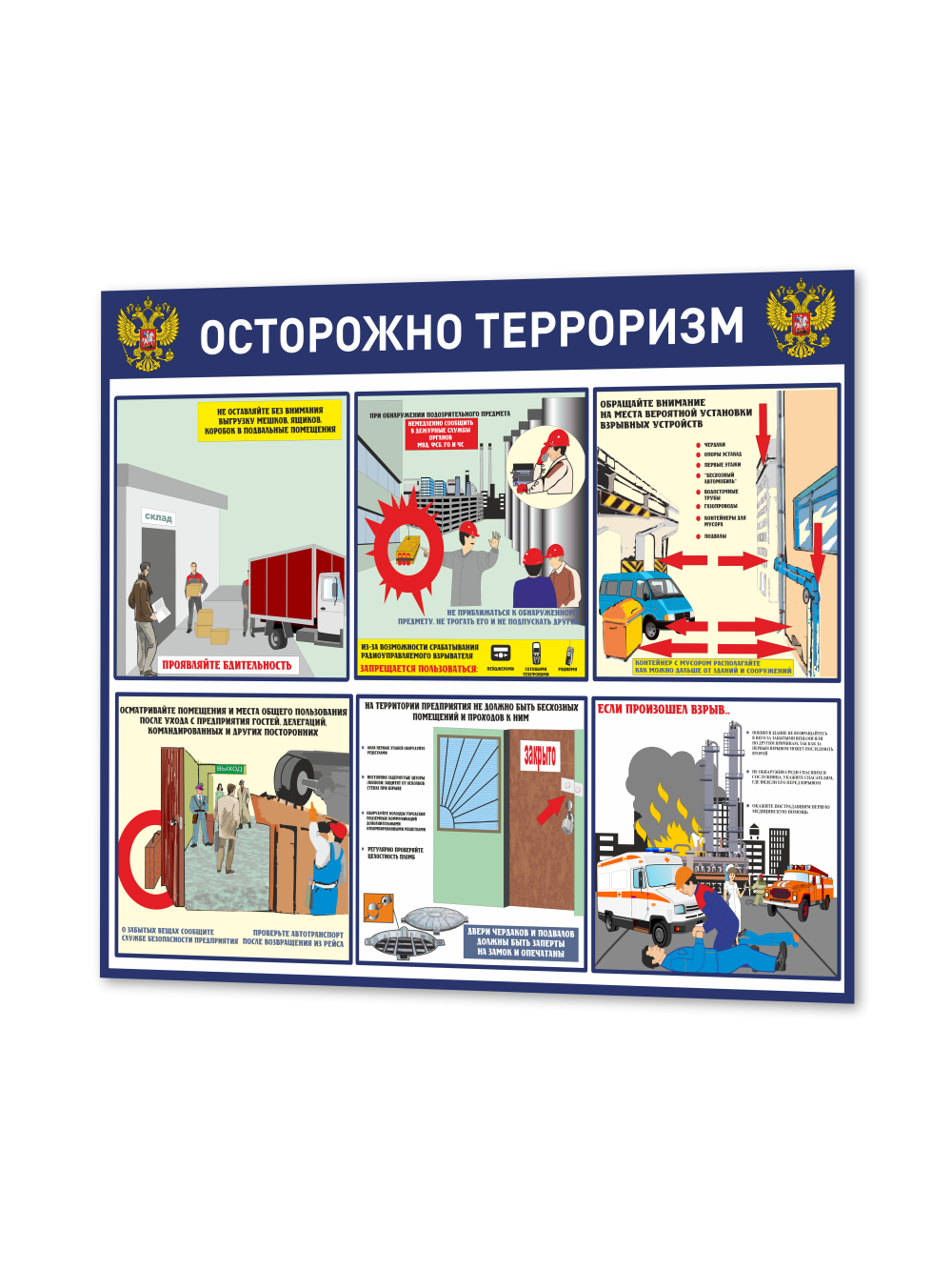 Стенд «Осторожно: терроризм» 75×65 см — информативный плакат из прочного ПВХ 3 мм с долговечной УФ-печатью, устойчивой к влаге, солнечному свету и механическим воздействиям. На обратной стороне размещена клейкая монтажная лента, позволяющая установить стенд без сверления и дополнительных крепежей.