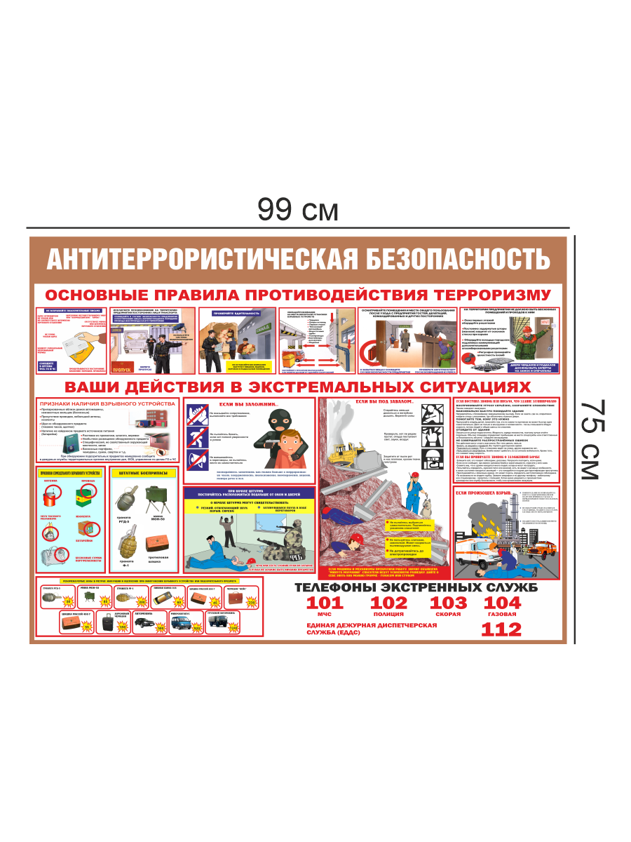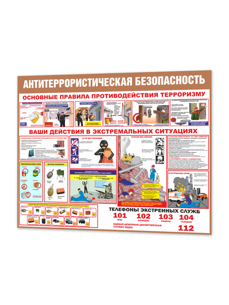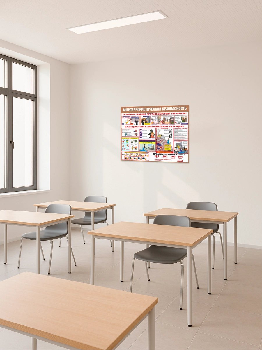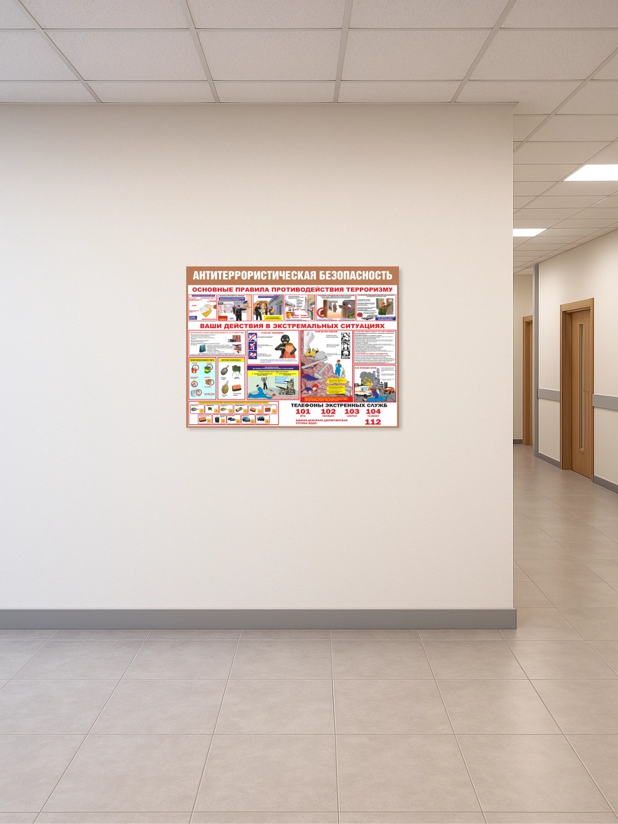 Изделие создано в соответствии с требованиями по информированию сотрудников и посетителей об антитеррористических мерах. Чёткая структура, крупные заголовки и наглядные иллюстрации делают информацию легко воспринимаемой даже с расстояния.
