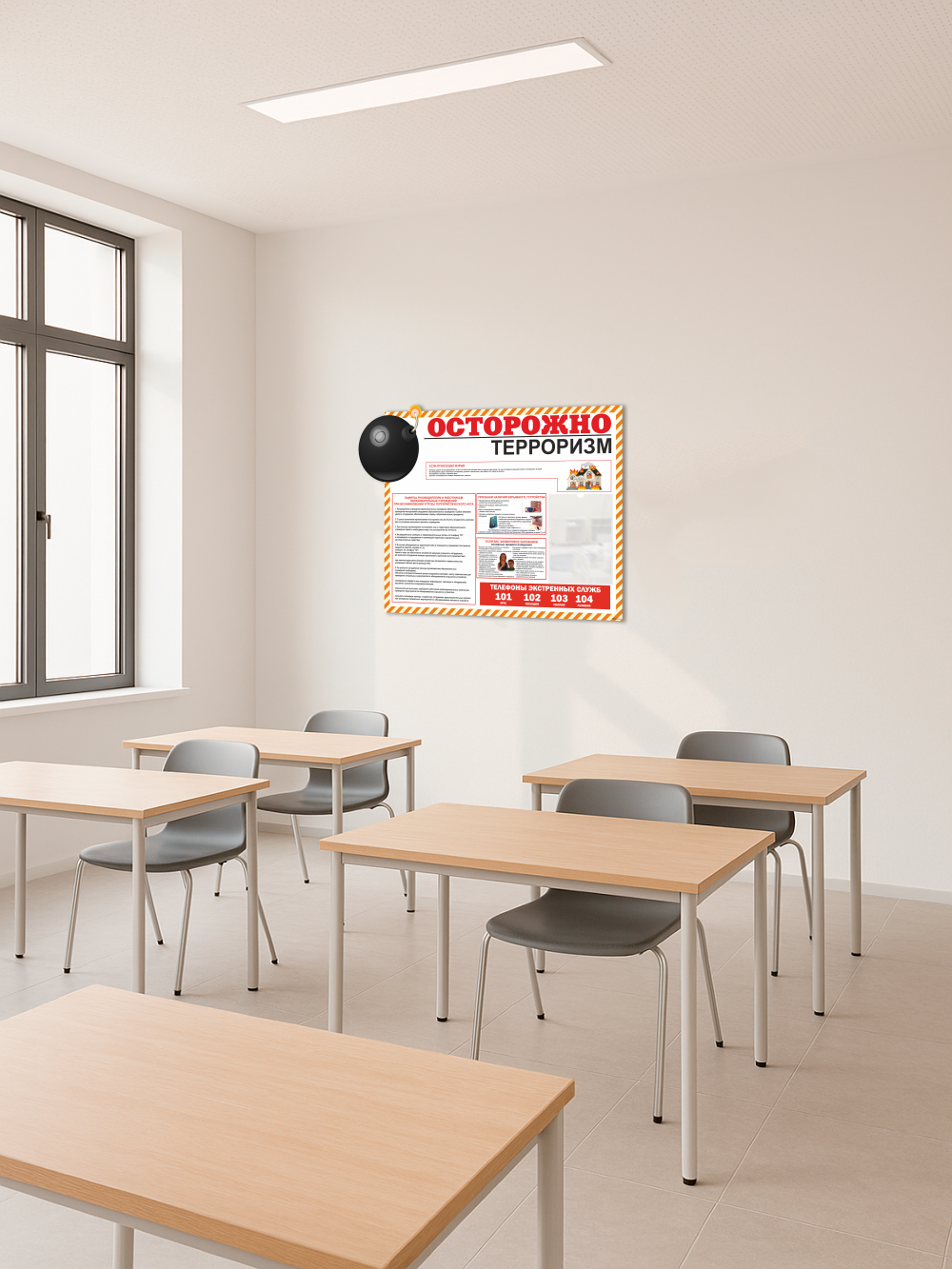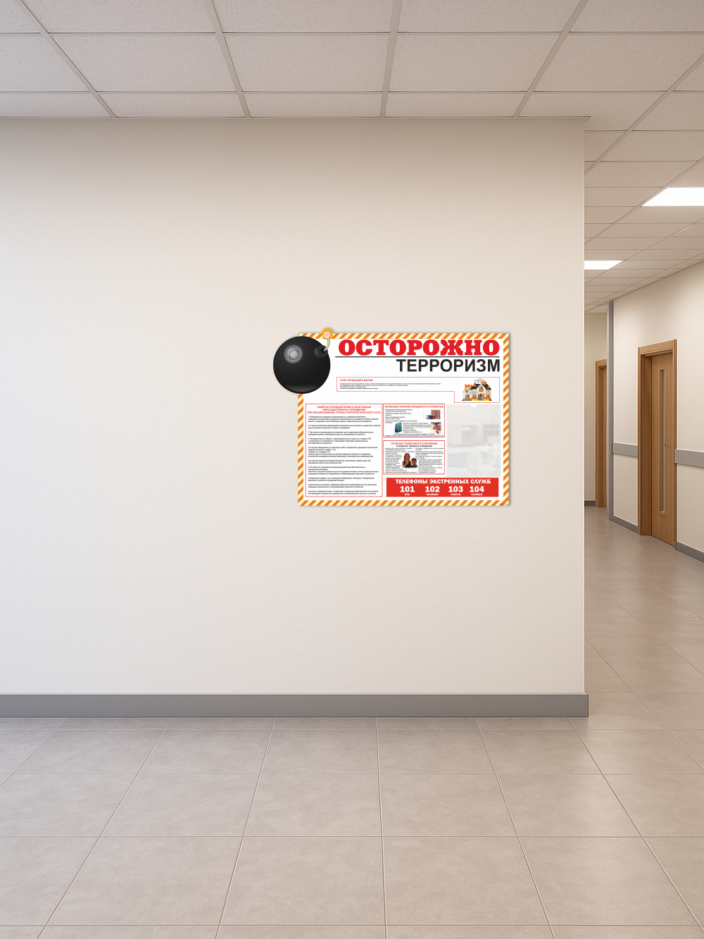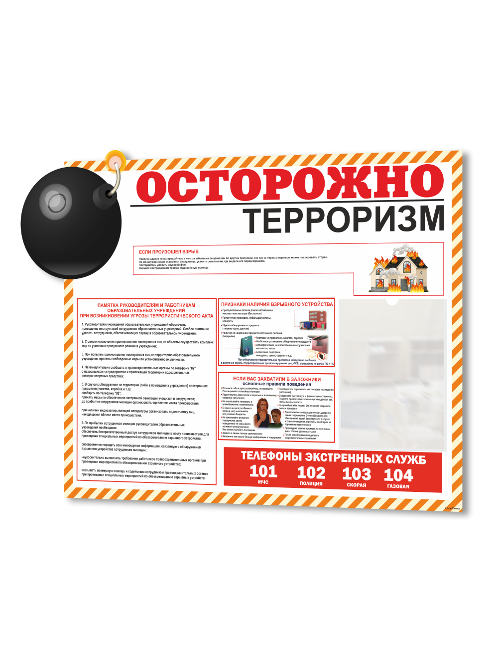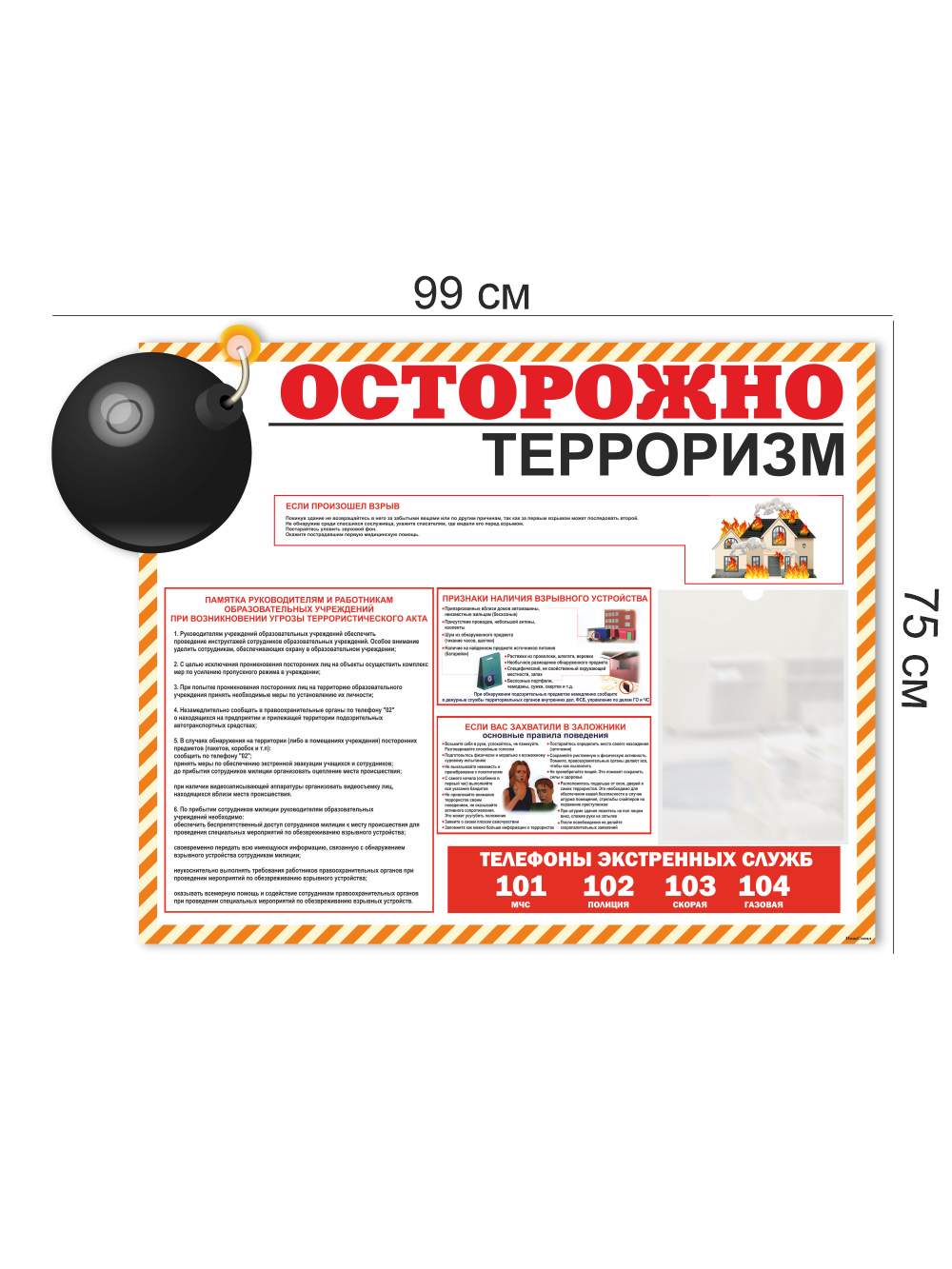 Стенд «Осторожно: терроризм» 99×75 см выполнен из прочного ПВХ 3 мм и напечатан стойкой УФ-печатью, которая не выцветает и не боится влажности. На обороте установлена клейкая монтажная лента, позволяющая закрепить стенд без сверления.