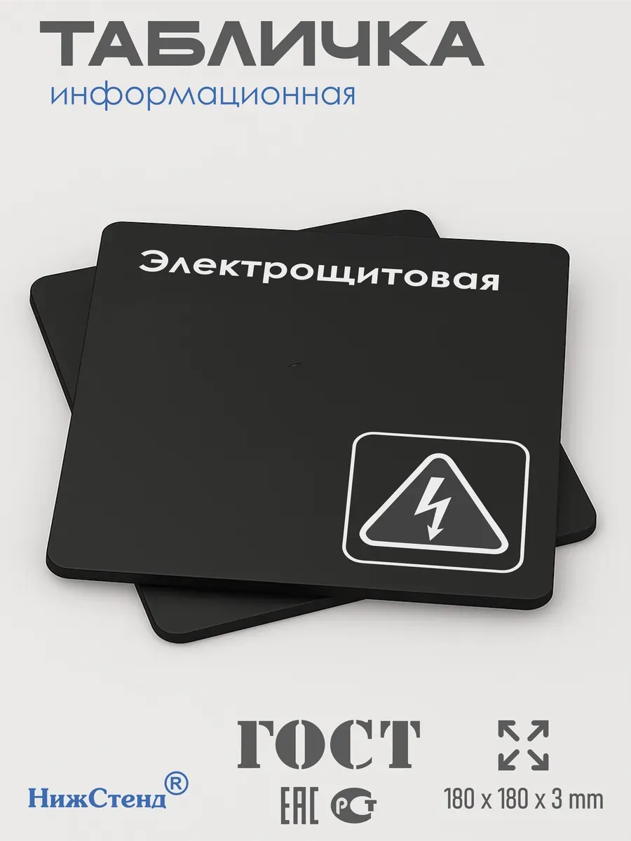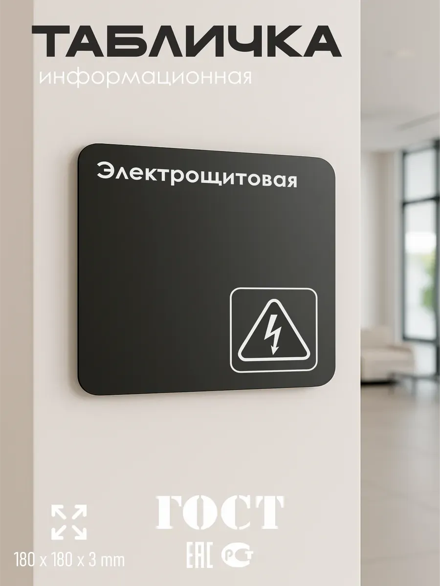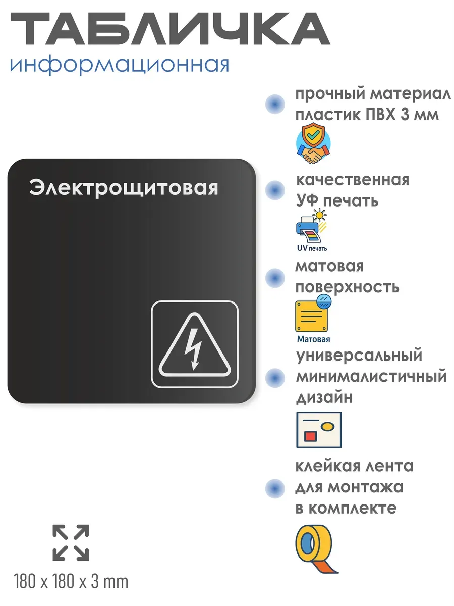 Черная табличка Электрощитовая с двусторонней клейкой лентой для монтажа в комплекте интерьерная из черного ПВХ 3мм размером 18х18 см – это стильный и универсальный декоративный элемент, который поможет создать особую атмосферу в вашем интерьере. Изготовлена из высококачественного ПВХ, она обладает прочностью и долговечностью, что делает ее идеальным выбором для использования в различных помещениях. На табличке имеется возможность нанесения различных надписей, все представлены в ассортименте. Благодаря черному цвету и минималистичному дизайну, она легко сочетается с любым интерьером и стилем оформления. Эта табличка является универсальным решением для множества задач. Вы можете использовать ее для обозначения названий комнат, оповещения и предупреждения граждан. Она идеально подходит для дома, офиса, ресторана, гостиницы, в школу, в гос. учреждения, в клинику, в больницу, в фитнес клуб. В магазине представлены таблички с надписями: мужской туалет, женский туалет, офис, склад, место для курения, для персонала, курение запрещено, чистые бахилы, грязные бахилы, надевайте бахилы, женская раздевалка, мужская раздевалка, банкомат, бассейн, администрация, офис, буфет, камера хранения, прачечная, выключайте звуки телефона, туалет, комната матери и ребенка, вход, выход, генеральный директор, касса, информация, комната ожидания, не бросайте в унитаз туалетную бумагу и предметы гигиены, камера хранения, за оставленные вещи администрация ответственности не несет, ведется видеонаблюдение, выключайте звуки мобильного телефона