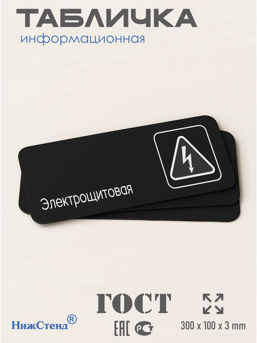 Черная табличка Электрощитовая с двусторонней клейкой лентой для монтажа в комплекте интерьерная из черного ПВХ 3мм размером 30х10 см – это стильный и универсальный декоративный элемент, который поможет создать особую атмосферу в вашем интерьере. Изготовлена из высококачественного черного ПВХ, она обладает прочностью и долговечностью, что делает ее идеальным выбором для использования в различных помещениях. На табличке имеется возможность нанесения различных надписей, все представлены в ассортименте. Благодаря черному цвету и минималистичному дизайну, она легко сочетается с любым интерьером и стилем оформления. Эта табличка является универсальным решением для множества задач. Вы можете использовать ее для обозначения названий комнат, оповещения и предупреждения граждан. Она идеально подходит для дома, офиса, ресторана, гостиницы, в школу, в гос. учреждения, в клинику, в больницу, в фитнес клуб. В магазине представлены таблички с надписями: мужской туалет, женский туалет, офис, склад, место для курения, для персонала, курение запрещено, чистые бахилы, грязные бахилы, надевайте бахилы, женская раздевалка, мужская раздевалка, банкомат, бассейн, администрация, офис, буфет, камера хранения, прачечная, выключайте звуки телефона, туалет, комната матери и ребенка, вход, выход, генеральный директор, касса, информация, комната ожидания, не бросайте в унитаз туалетную бумагу и предметы гигиены, камера хранения, за оставленные вещи администрация ответственности не несет, ведется видеонаблюдение, выключайте звуки мобильного телефона
