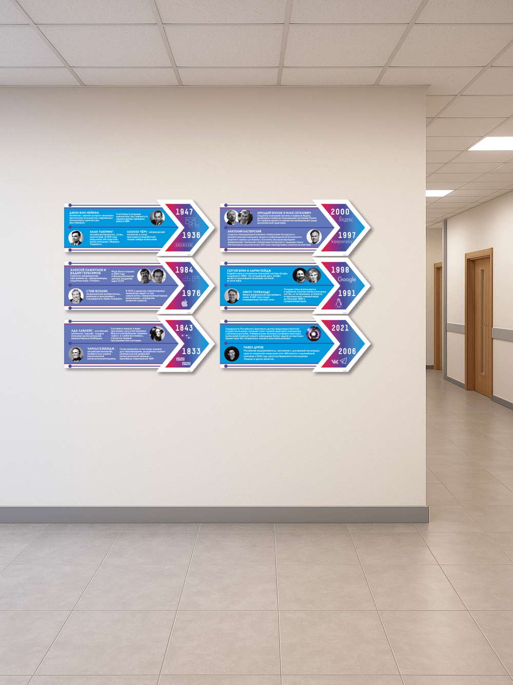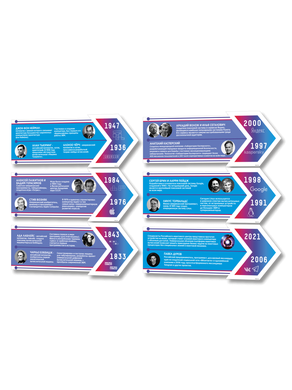 Декоративные элементы для школы в кабинет информатики история развития компьютерной техники размером 6 штук в комплекте 99х37 см каждый изготовлены из пластика ПВХ толщиной 3 мм с применением технологии прямой УФ печати по пластику, что делает стенды устойчивыми к выгоранию, влажности и любым внешним воздействиям. При необходимости стенды можно протирать влажной тряпкой или салфетками. На обратной стороне – двусторонний скотч для монтажа стендов на стену без сверления. Товар имеет сертификат ГОСТ и изготовлен из материалов не поддерживающих горение, подходит для размещения в любых образовательных учреждениях.