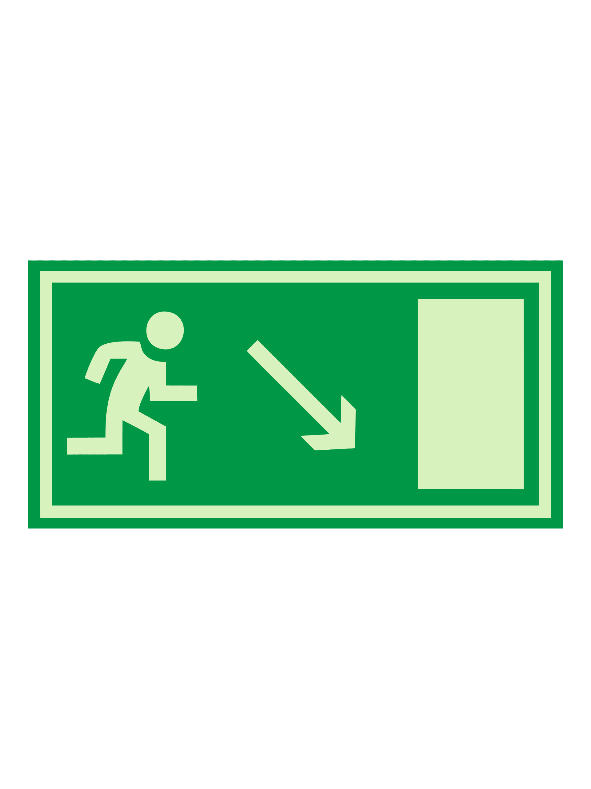 Фотолюминесцентная табличка Е 07 «Направление к эвакуационному выходу направо вниз» предназначена для обозначения маршрута эвакуации, который ведёт по диагонали вниз и вправо — к лестничному пролёту, спуску или выходу, расположенному на более низком уровне. Используется в местах, где требуется чёткая и интуитивно понятная навигация в условиях чрезвычайной ситуации.