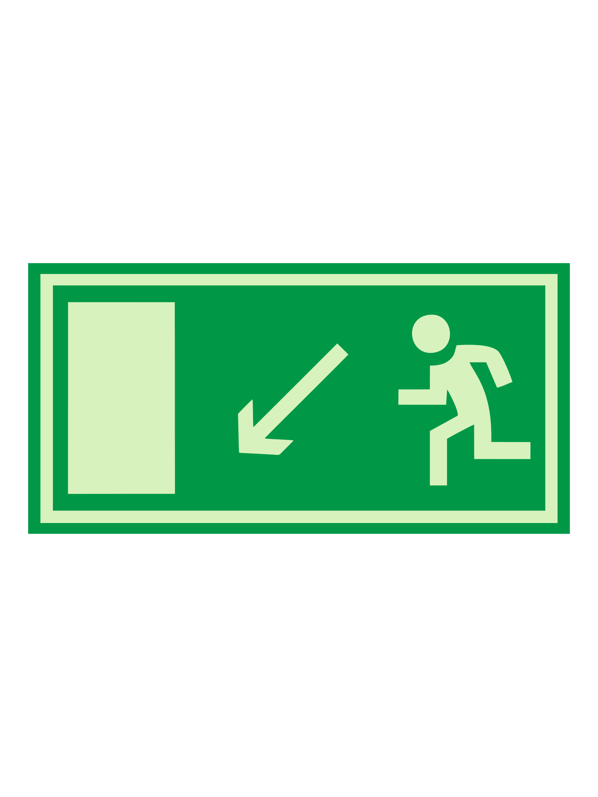 Фотолюминесцентная табличка Е 08 «Направление к эвакуационному выходу налево вниз» служит для обозначения направления движения по эвакуационному маршруту, ведущему по диагонали вниз и влево. Применяется на путях эвакуации, где выход или лестничный спуск расположен на более низком уровне относительно текущего помещения.