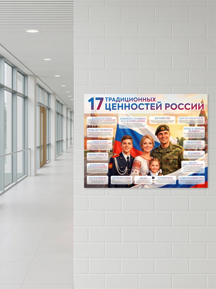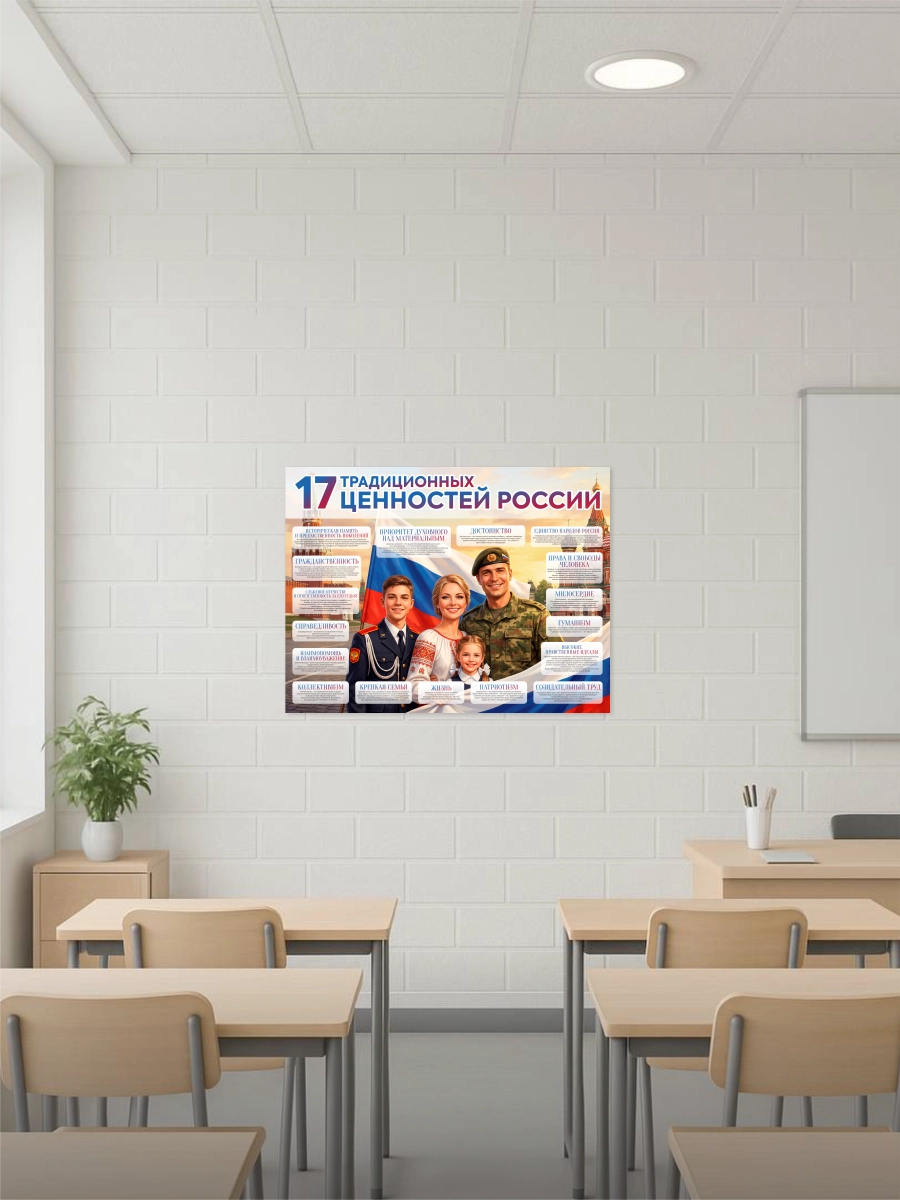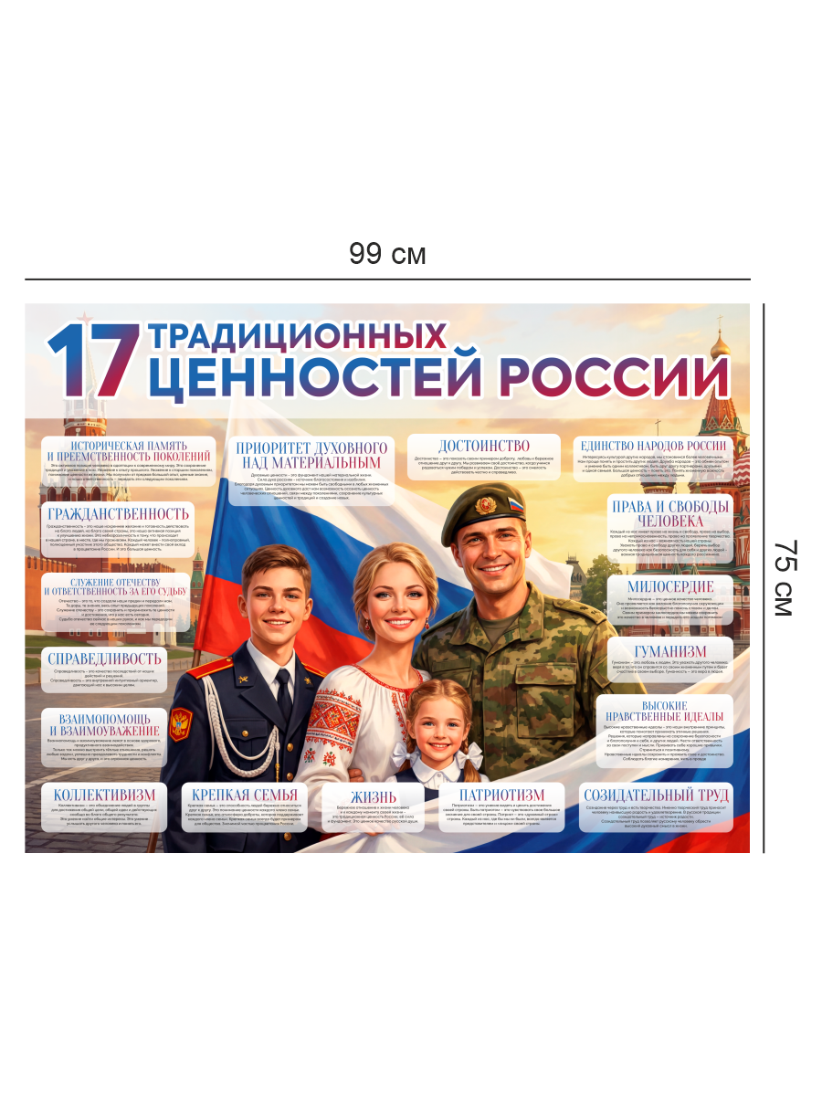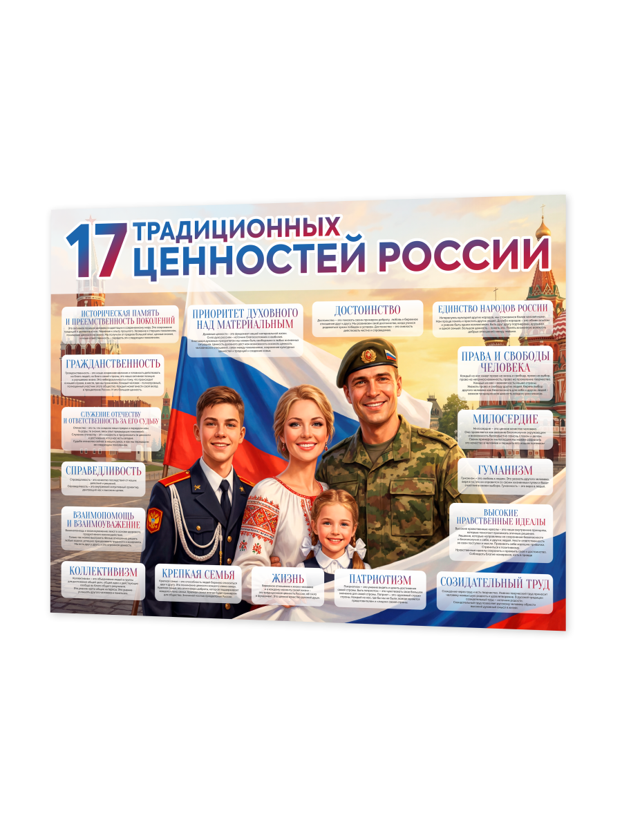 Информационный стенд «17 традиционных ценностей России» — патриотический настенный стенд для школ, колледжей, детских садов, учреждений культуры, военных и государственных организаций. На стенде представлены основные духовно-нравственные и гражданские ценности российского общества в современном наглядном формате.