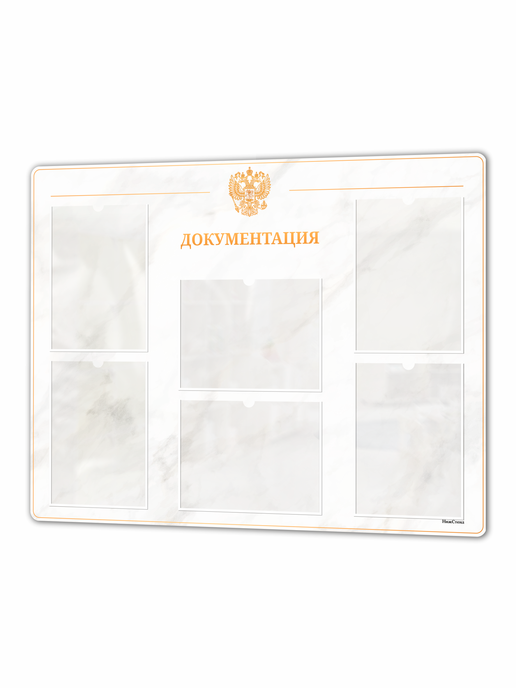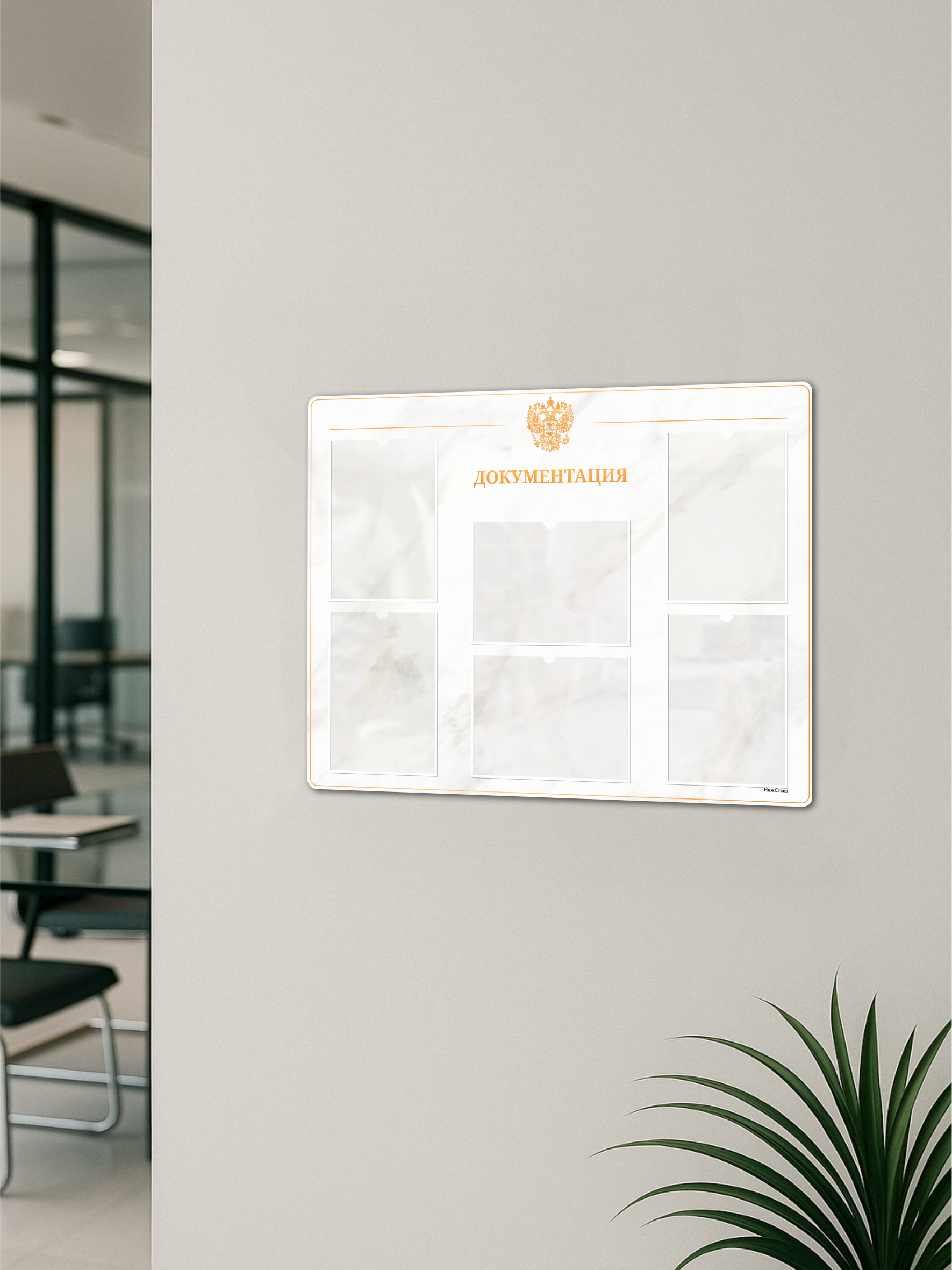 Стенд выполнен из прочного ПВХ 3 мм с качественной УФ-печатью, устойчивой к истиранию и выцветанию. Оснащен 6 прозрачными карманами формата А4 для удобного размещения документов, приказов, графиков, инструкций и иной информации. Подходит для офисных помещений, приемных, кабинетов, учебных заведений, государственных и коммерческих организаций.