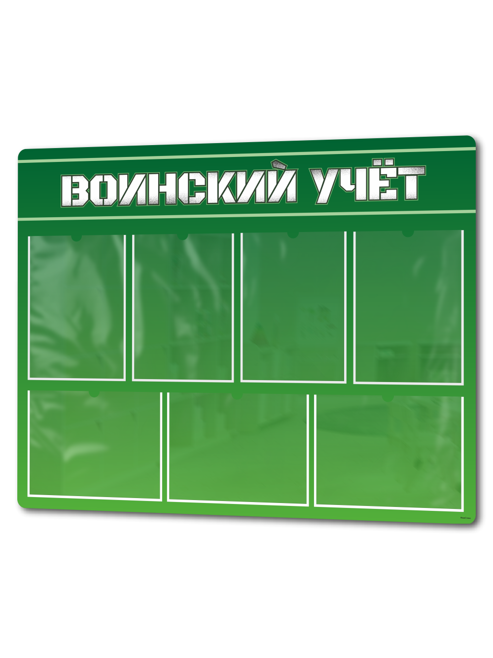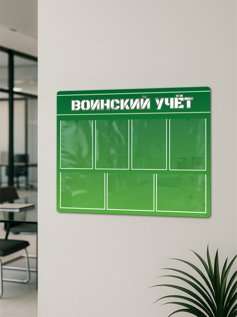 — 4 вертикальных, идеально подходящих для приказов, нормативных документов и обязательной информации по воинскому учёту.