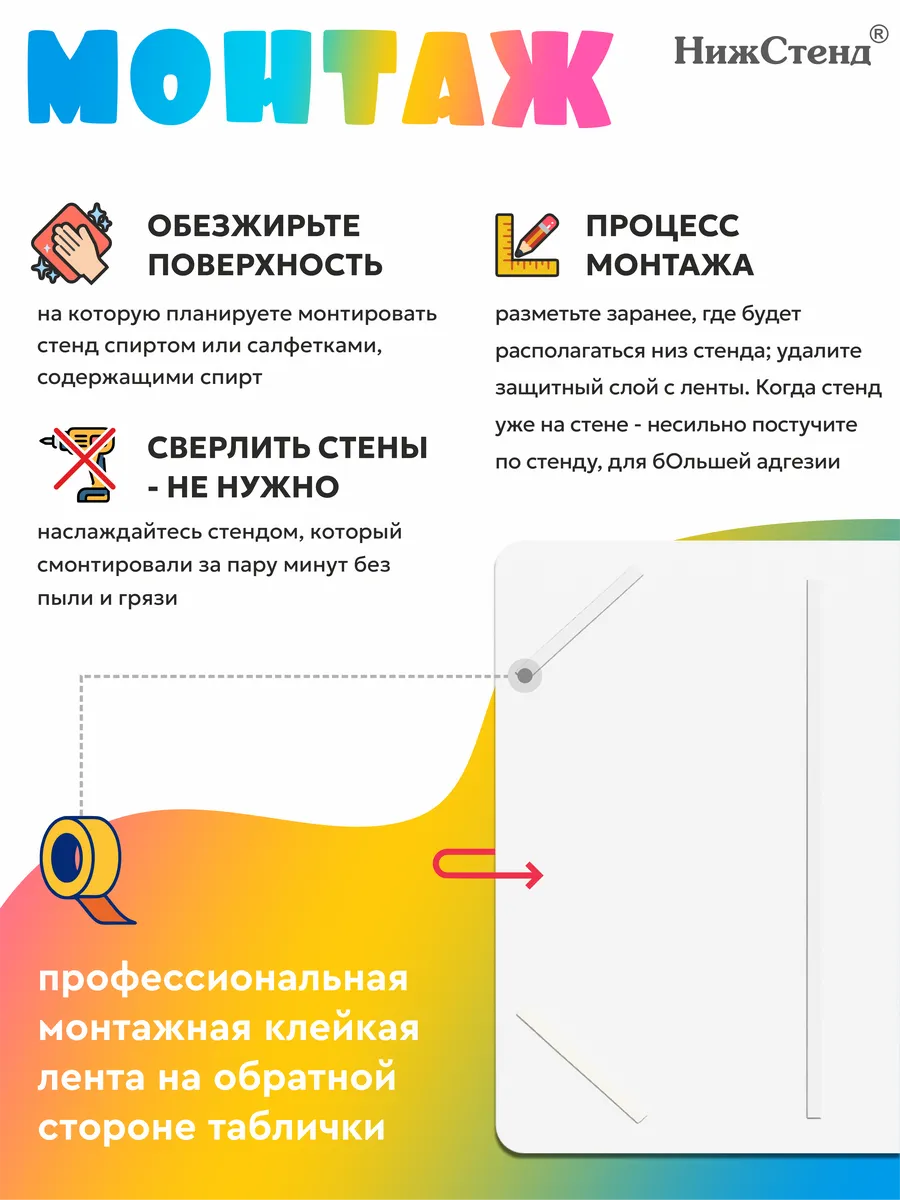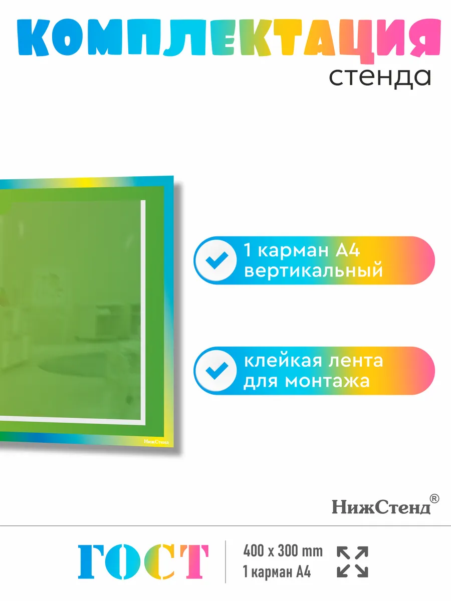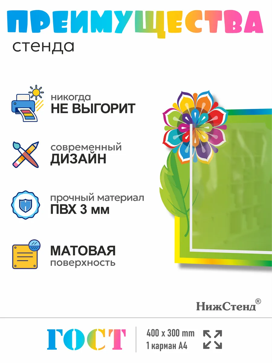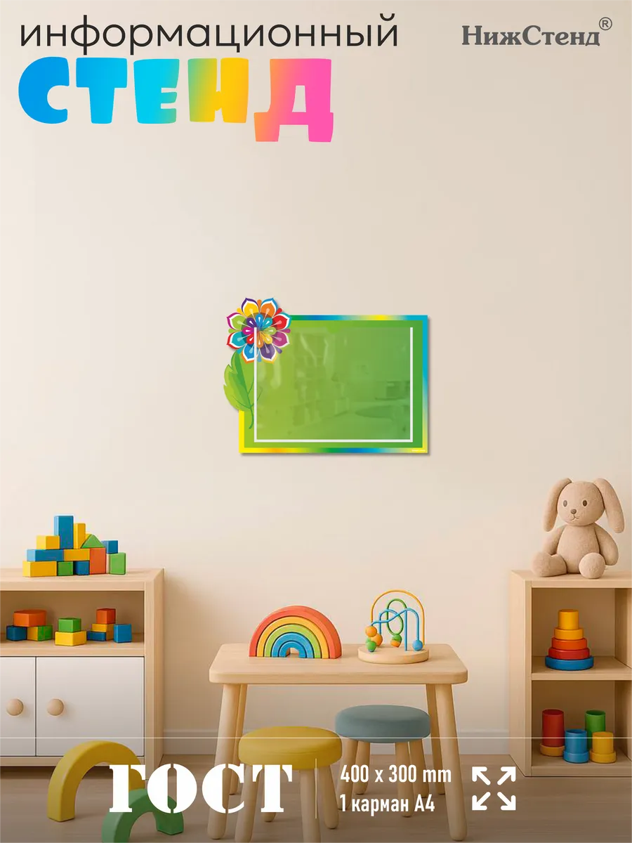 Стенд информационный в садик изготовлен из ПВХ 3мм с приминением технологии прямой УФ печати по пластику, что делает стенд устойчивчм к выгоранию и влажности, так же стенд можно протирать от загрязнений влажно тряпкой или салфетками. На стенде – вертикальный плоский карман А4. На обратной стороне стенда – двусторонняя клейкая лента для монтажа стенда на стену без сверления. Размер стенда – 30х40 см. Стенды для школы. Стенды для детского сада. Стенды для детей это неотъемлемая часть помещений, в которых проводят время школьники и дошкольники. Детский стенд помогает малышам познавать мир, а школьникам и дошкольникам знакомится с историей и получать необходимые знания. Детские стенды яркие и обязательно привлекут к себе внимание. Стенд «Информация для родителей» предназначен для информационно-справочных материалов для родителей в детском саду, а для малышей — выглядит веселым интересным украшением. Педагогическая пропаганда, развитие ребенка, вести с занятий, приказы, памятки, анкеты и прочие важные темы играют немаловажную роль в поддержании связи между администрацией/воспитателями детского сада и родителями. Такое оформление детского творчества придаст образовательному процессу атмосферу гармонии, веселья и повысит настроение малышей. Все изображения устойчивы к влаге и выгоранию, при необходимости можно мыть. Также изображения не сдираются и не царапаются. Все стенды имеют сертификат ГОСТ и изготовлены из нетоксичных материалов. Наши информационные стенды обязательно должны быть в Вашем интерьере! Если у Вас остались вопросы, задайте нам их и мы Вам обязательно ответим! Будем признательны, если после покупки Вы оставите нам отзыв с фото! Будем рады видеть Вас среди наших покупателей!