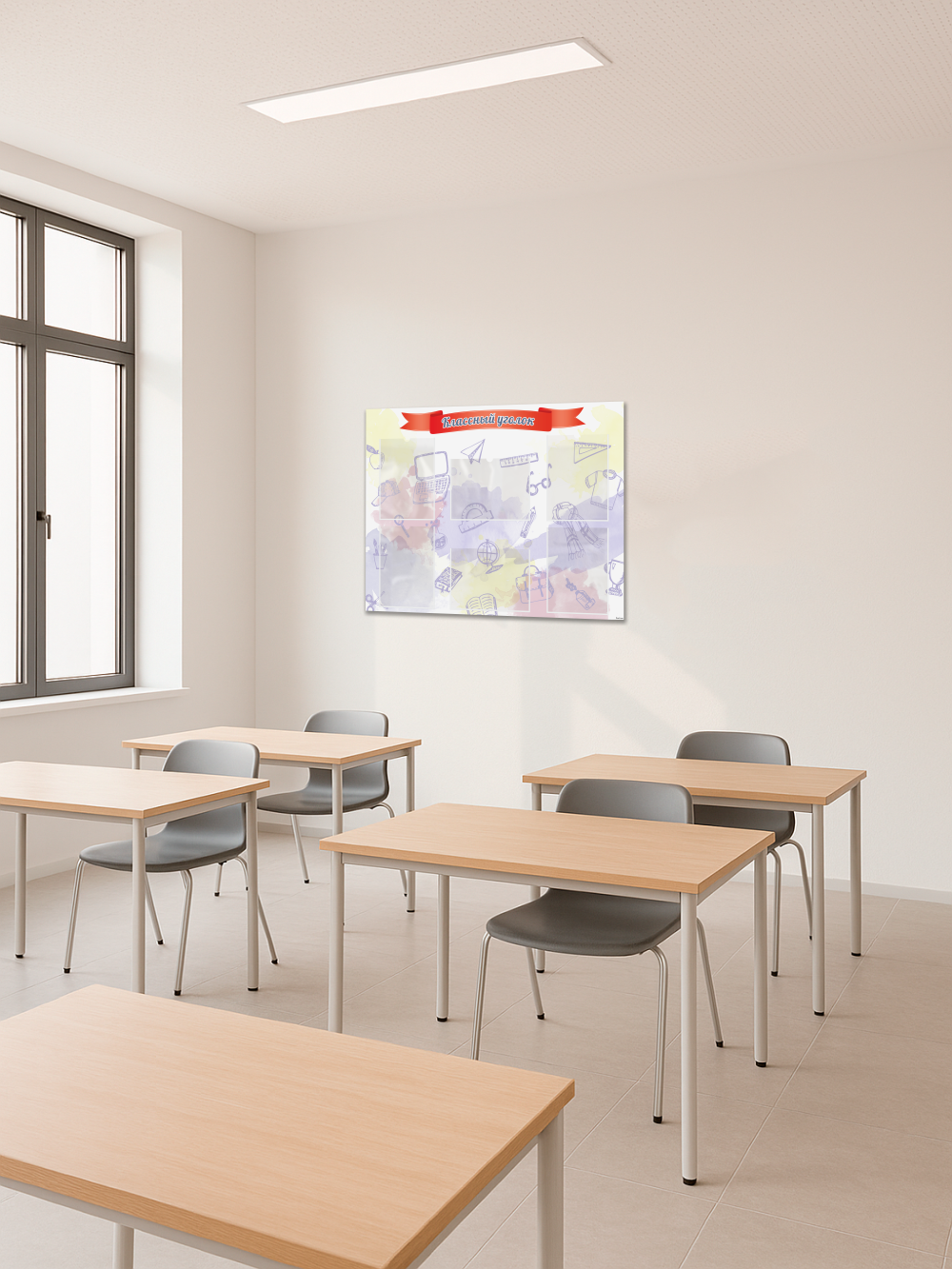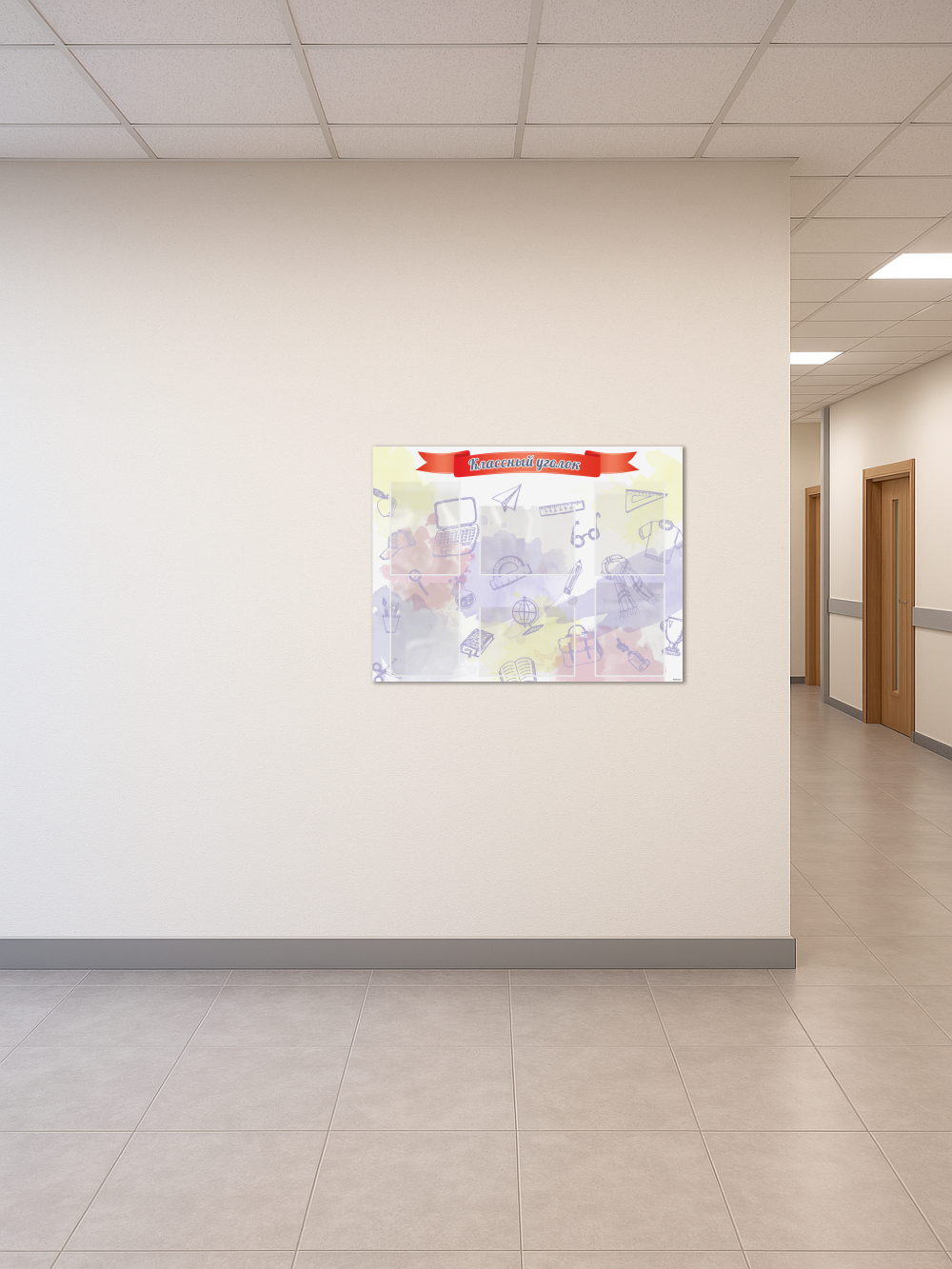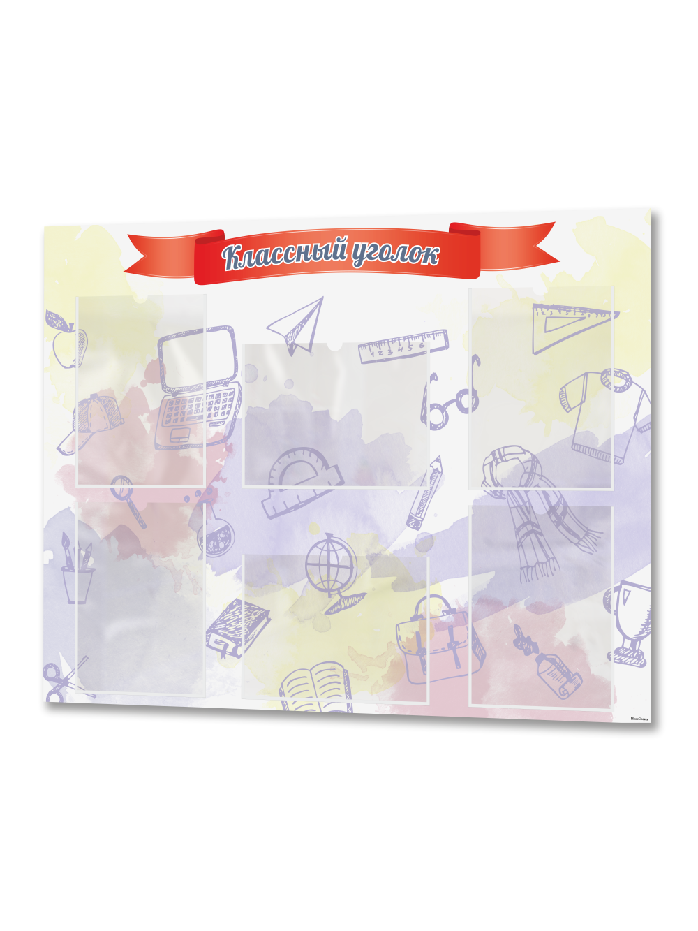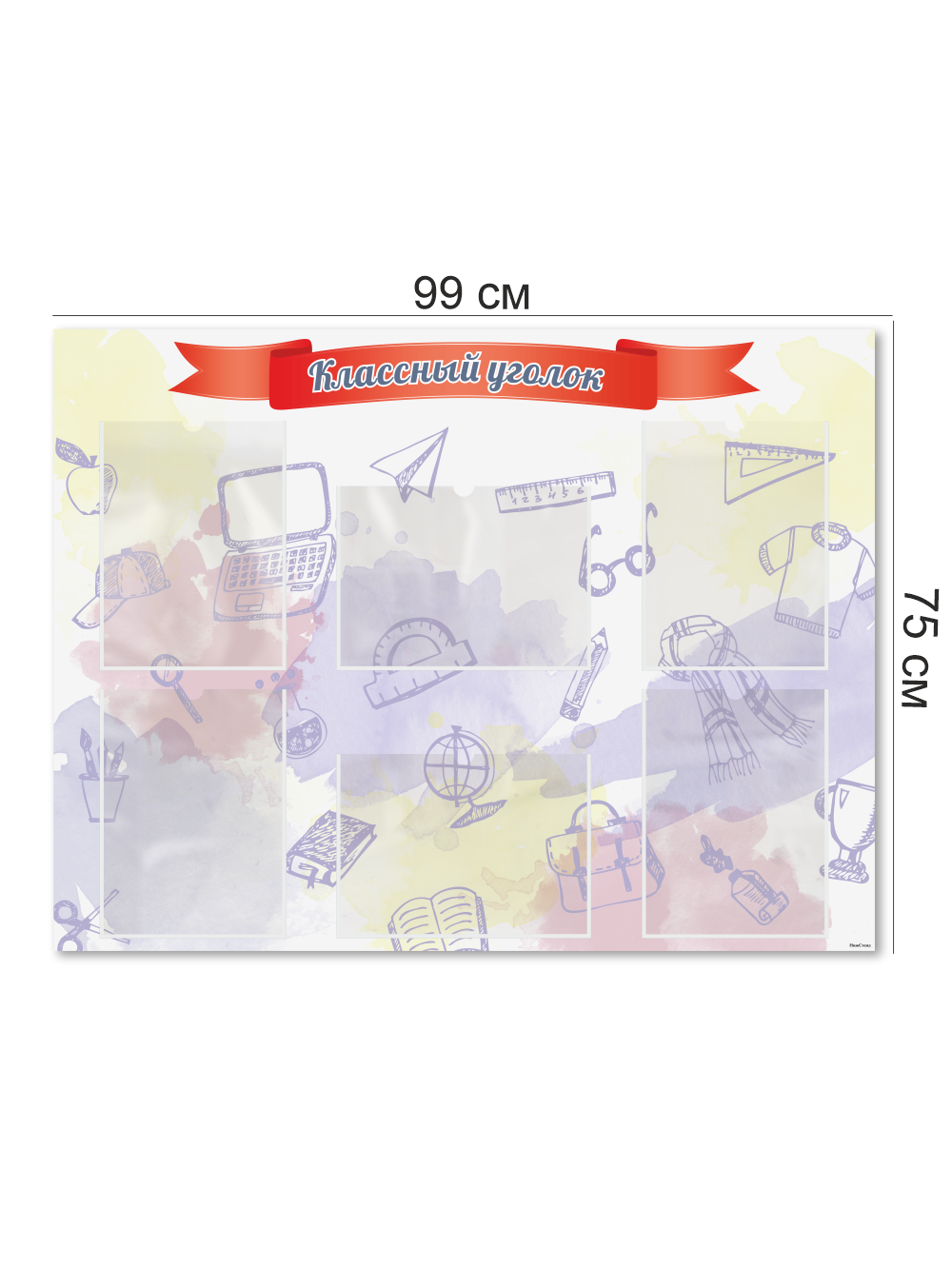 Классный уголок размером 99×75 см – это идеальный аксессуар для оформления школьного класса. На стенде расположены 6 карманов формата A4, в которые можно вставить важную информацию для учеников, родителей или учителей. Стенд выполнен из качественного и прочного материала с двусторонней клейкой лентой на обратной стороне, что позволяет легко и быстро установить его на стену без сверления и без помощи сторонних специалистов.