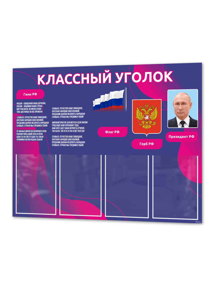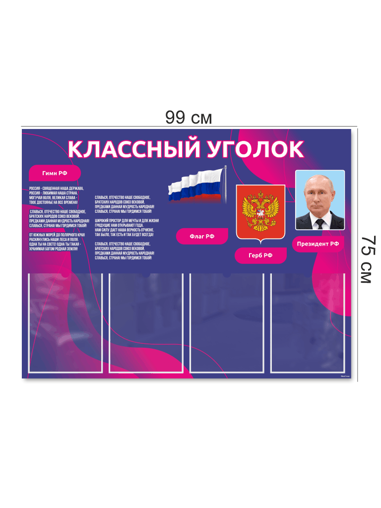 Классный уголок размером 99×75 см – это идеальный аксессуар для оформления школьного класса. На стенде расположены четыре кармана формата A4, в которые можно вставить важную информацию для учеников, родителей или учителей. Стенд выполнен из качественного и прочного материала с двусторонней клейкой лентой на обратной стороне, что позволяет легко и быстро установить его на стену без сверления и без помощи сторонних специалистов.