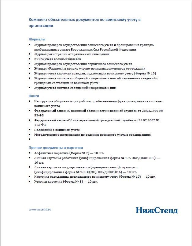 Комплект обязательных документов и журналов по воинскому учету — это готовое решение для организаций, которые обязаны вести воинский учет сотрудников в соответствии с требованиями законодательства РФ. Набор подходит для коммерческих компаний, бюджетных учреждений, ИП с наемными работниками, а также для подготовки к проверкам военкомата и контролирующих органов.