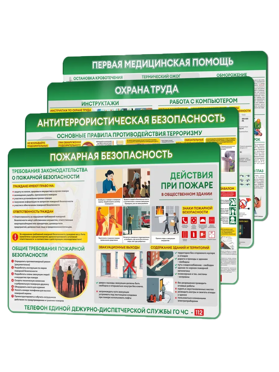 Комплект стендов в зеленом цвете представлен позициями: Пожарная безопасность; Антитеррористическая безопасность; Охрана труда; Первая медицинская помощь, 750×500 мм, ПВХ 3 мм, ГОСТ