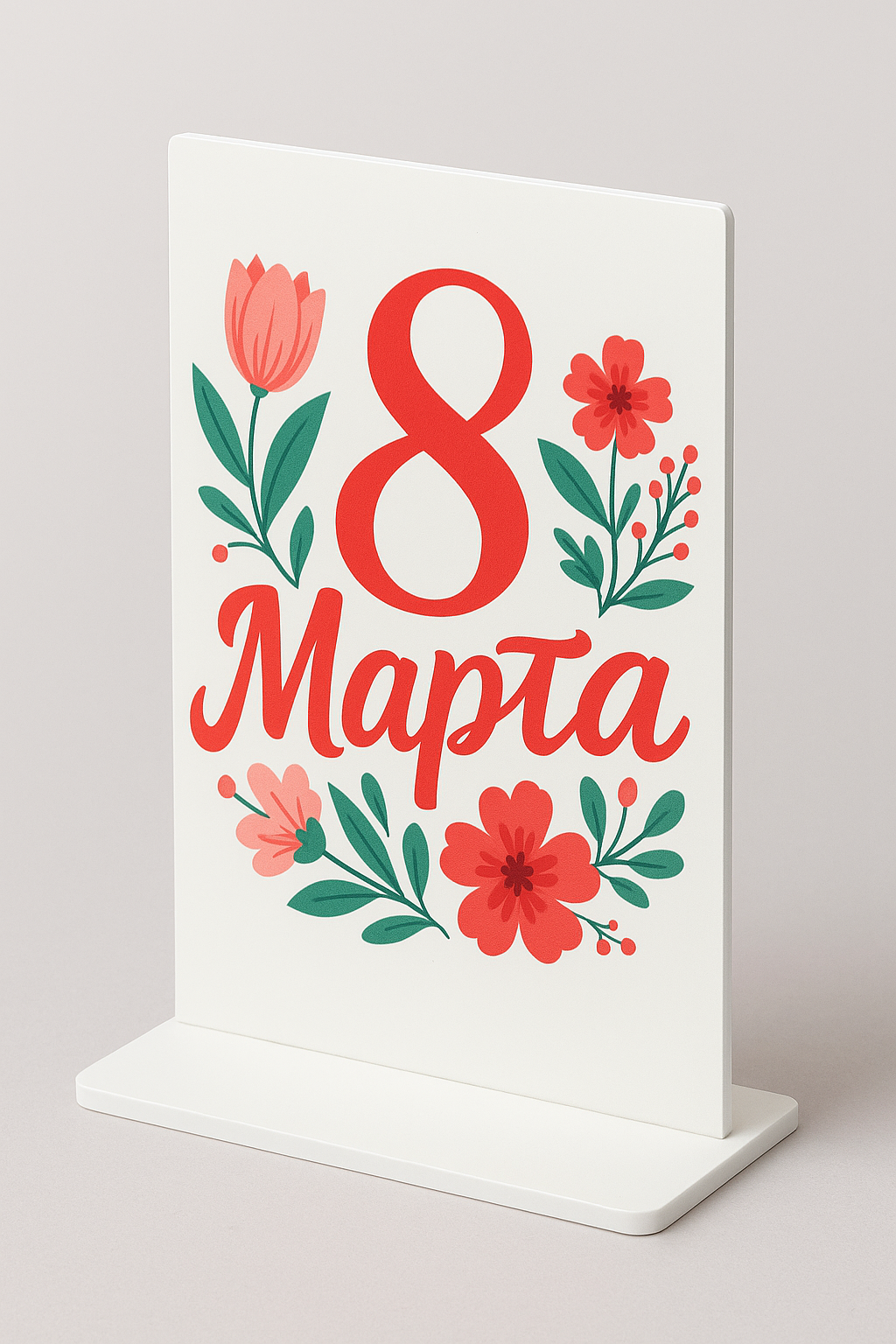 Элегантный настольный тейблтенд «8 Марта» — праздничный элемент декора для витрин, ресепшенов, кафе и офисов. Выполнен из прочного ПВХ толщиной 3 мм с УФ-печатью высокого качества. Бело-золотая цветовая гамма, изящный шрифт и акварельные цветы создают атмосферу весенней лёгкости и стиля.