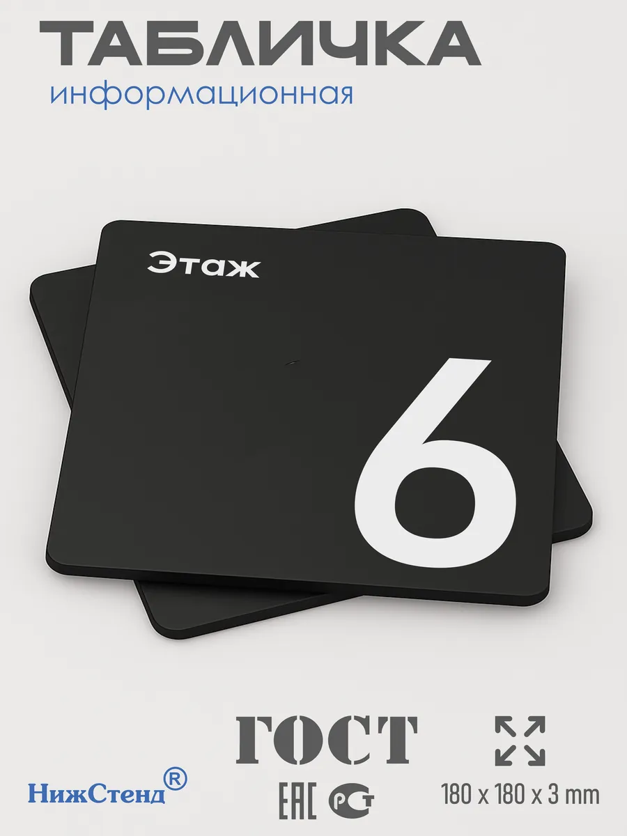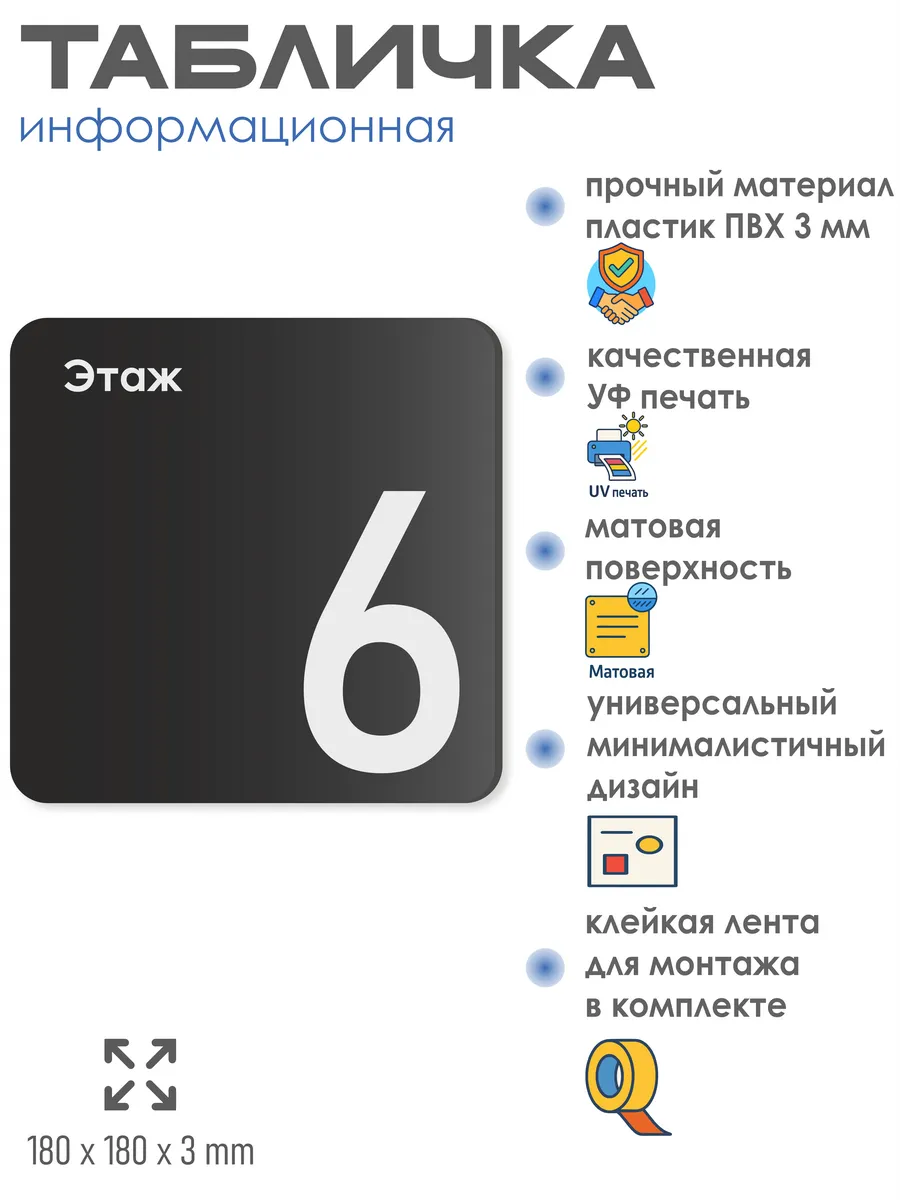 Табличка шестой 6 этаж с двусторонней клейкой лентой для монтажа в комплекте директор интерьерная из черного ПВХ 3мм размером 18х18 см – это стильный и универсальный декоративный элемент, который поможет создать особую атмосферу в вашем интерьере. Изготовлена из высококачественного ПВХ, она обладает прочностью и долговечностью, что делает ее идеальным выбором для использования в различных помещениях. На табличке имеется возможность нанесения различных надписей, все представлены в ассортименте. Благодаря черному цвету и минималистичному дизайну, она легко сочетается с любым интерьером и стилем оформления. Эта табличка является универсальным решением для множества задач. Вы можете использовать ее для обозначения названий комнат, оповещения и предупреждения граждан. Она идеально подходит для дома, офиса, ресторана, гостиницы, в школу, в гос. учреждения, в клинику, в больницу, в фитнес клуб. В магазине представлены таблички с надписями: мужской туалет, женский туалет, офис, склад, место для курения, для персонала, курение запрещено, чистые бахилы, грязные бахилы, надевайте бахилы, женская раздевалка, мужская раздевалка, банкомат, бассейн, администрация, офис, буфет, камера хранения, прачечная, выключайте звуки телефона, туалет, комната матери и ребенка, вход, выход, генеральный директор, касса, информация, комната ожидания, не бросайте в унитаз туалетную бумагу и предметы гигиены, камера хранения, за оставленные вещи администрация ответственности не несет, ведется видеонаблюдение, выключайте звуки мобильного телефона