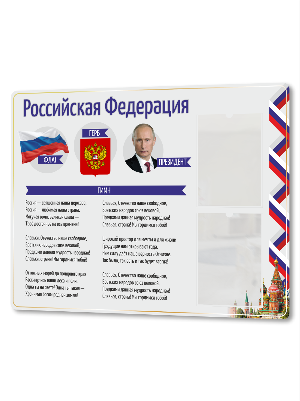 Патриотический стенд с символикой РФ – флаг, герб, гимн, фото президента, 2 кармана А4