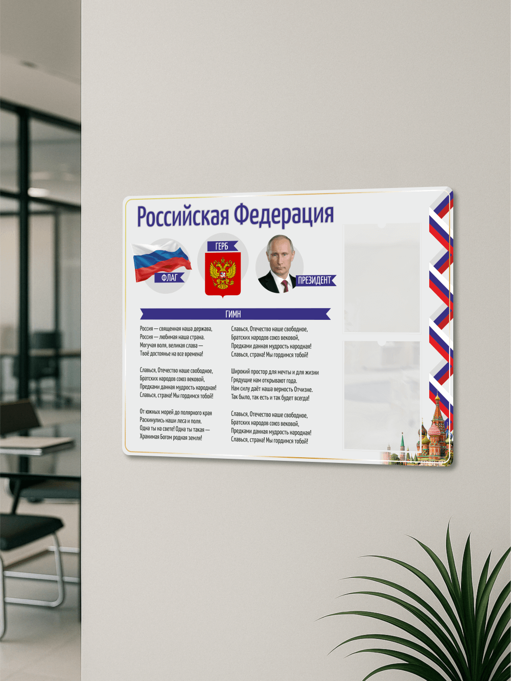Стенд с государственной символикой РФ поможет создать официальную и уважительную атмосферу, подчеркнёт патриотизм и станет неотъемлемой частью оформления вашего пространства.