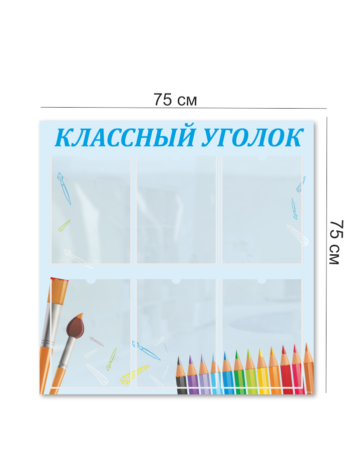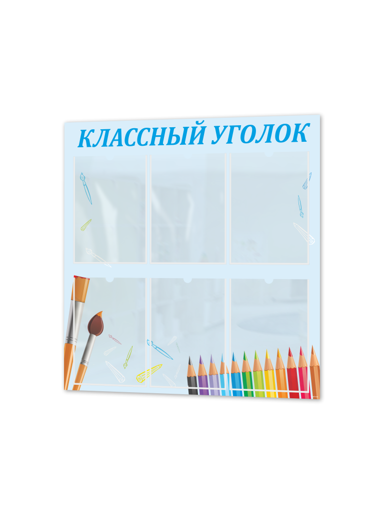 Классный уголок размером 75×75 см – это идеальный аксессуар для оформления школьного класса. На стенде расположены 6 карманов формата A4, в которые можно вставить важную информацию для учеников, родителей или учителей. Стенд выполнен из качественного и прочного материала с двусторонней клейкой лентой на обратной стороне, что позволяет легко и быстро установить его на стену без сверления и без помощи сторонних специалистов.