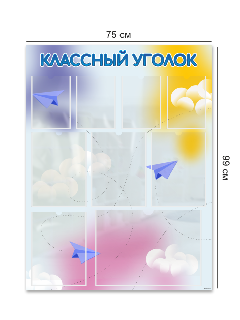 Классный уголок размером 75×99 см – это идеальный аксессуар для оформления школьного класса. На стенде расположены четыре кармана формата A4 вертикальной ориентации, 4 кармана А5 вертикальной ориентации и один карман А3 горизонтальной ориентации, в которые можно вставить важную информацию для учеников, родителей или учителей. Стенд выполнен из качественного и прочного материала с двусторонней клейкой лентой на обратной стороне, что позволяет легко и быстро установить его на стену без сверления и без помощи сторонних специалистов.