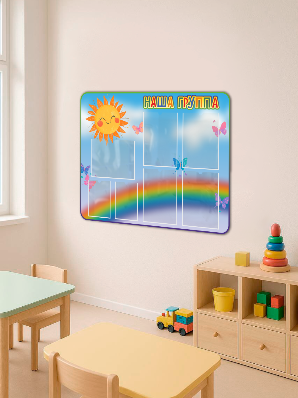 Стенд станет ярким акцентом интерьера и поможет организовать информирование родителей: меню, расписание, важные новости, творческие работы детей — всё на виду и в одном месте.