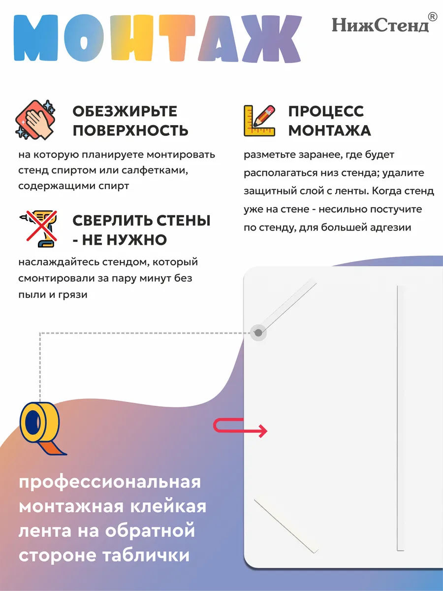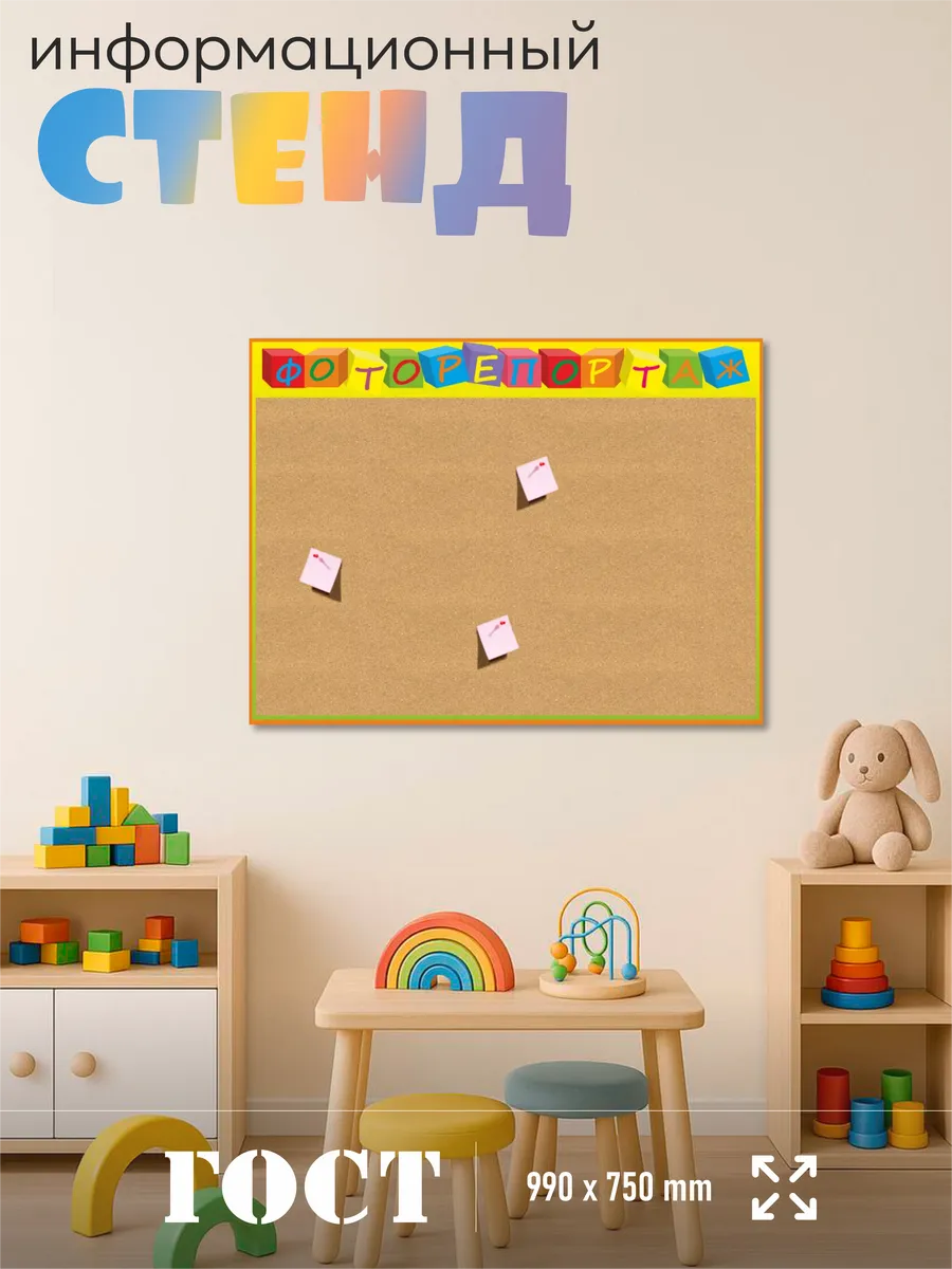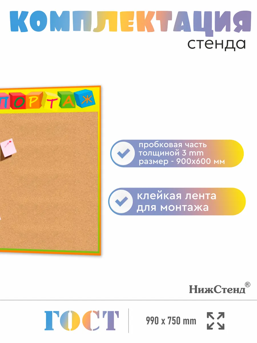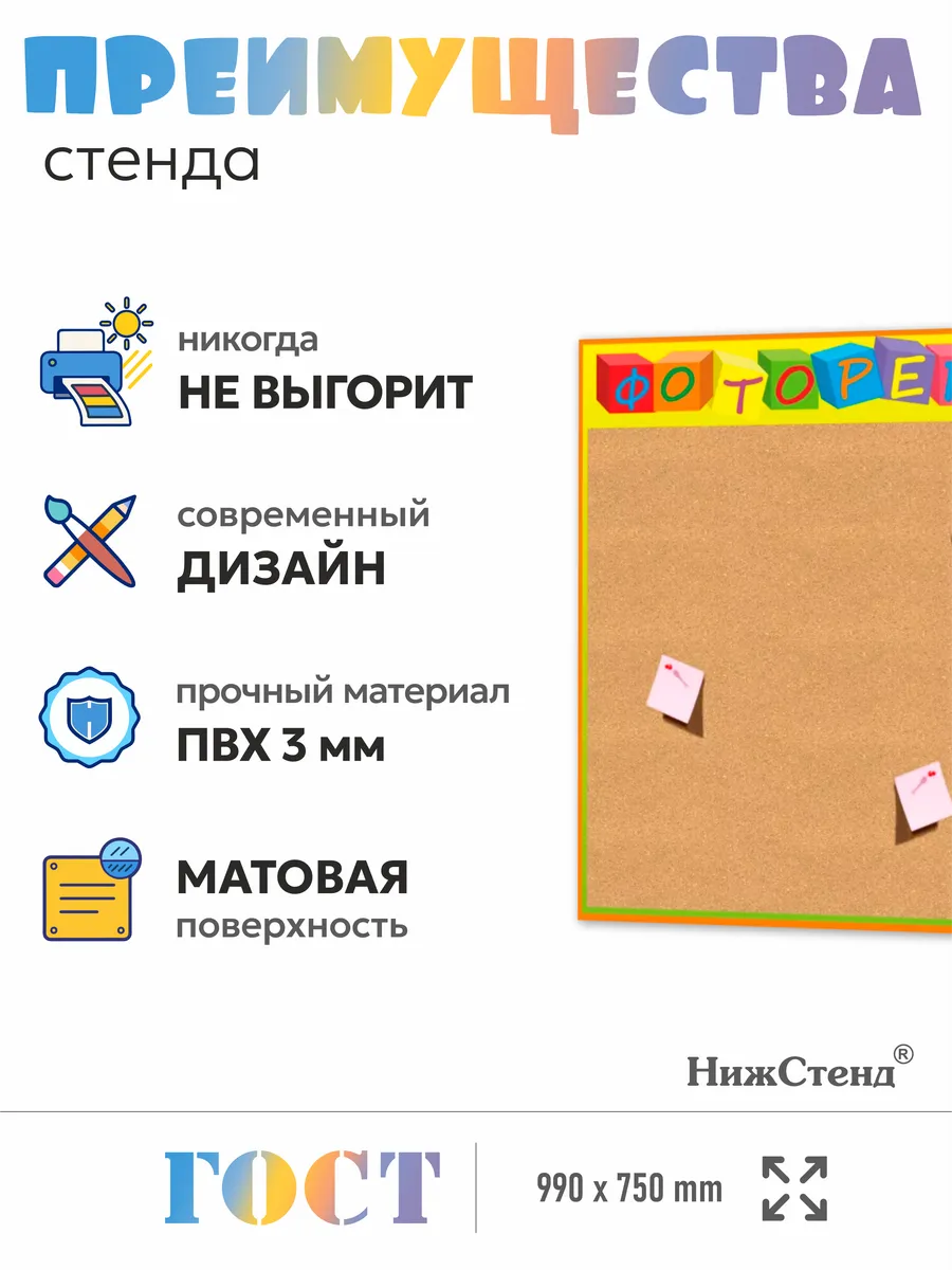 Стенд для фотографий в детский сад размером 99х75 см – выполнен из пластика ПВХ 3мм с применением технологии прямой УФ печати по пластику, что делает изображение на стенде устойчивым к выгоранию, а также стенд при необходимости можно мыть влажной тряпкой или салфетками. На обратной стороне стенда – двусторонняя клейкая лента для монтажа стенда на стену без сверления. Размер пробкового покрытия 960х612 мм. Товар имеет сертификат ГОСТ и изготовлен из негорючих нетоксичных материалов. Пробковая доска – это универсальное решения для размещения большого количества информации с возможностью оперативной замены, благодаря покрытию из пробки, на которое можно закреплять листы с информацией на канцелярские кнопки
