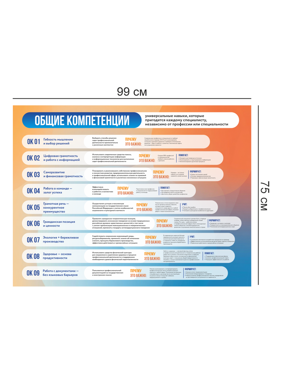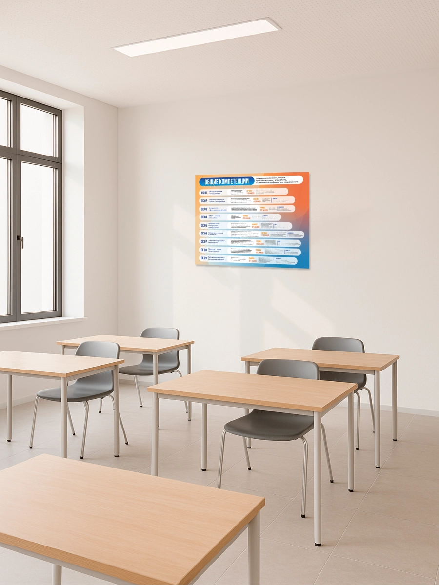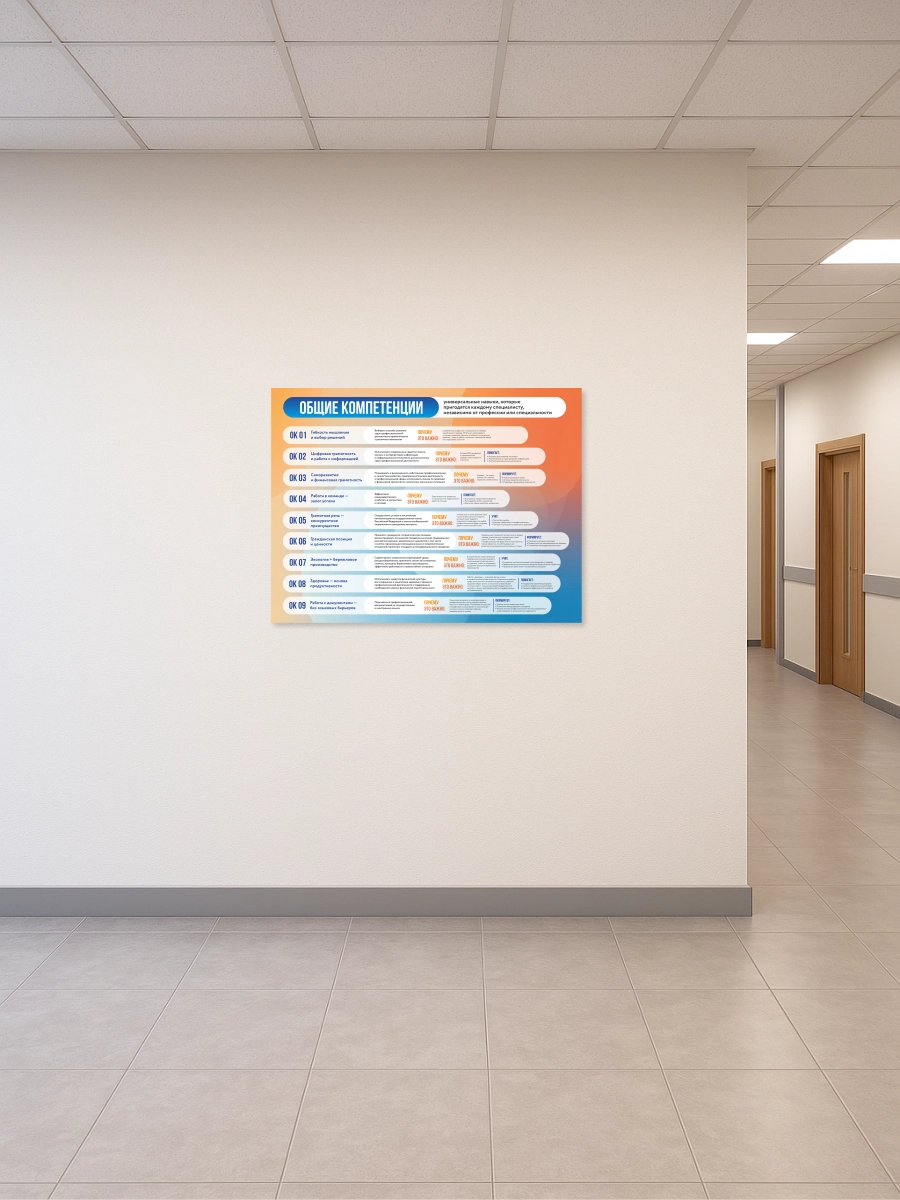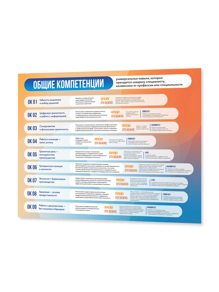 Информационный стенд «Общие компетенции» – это наглядное оформление учебных аудиторий и профориентационных зон. Он знакомит студентов с ключевыми универсальными навыками, необходимыми каждому специалисту независимо от профессии или направления обучения.