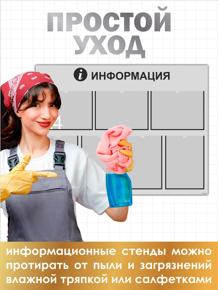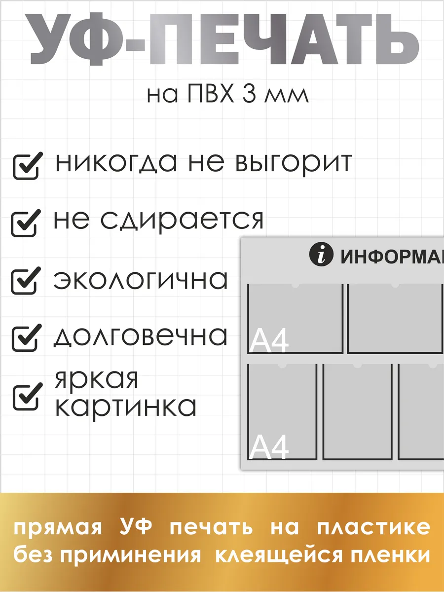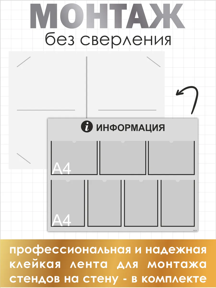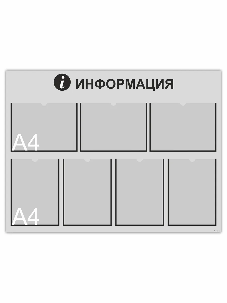 Стенд информационный с 7 карманами А4 серый с горизональными и вертикальными карманами. Информационный стенд является универсальным решением и отлично подойдет для школы, детского сада, ДОУ, СНТ, родителей, гостиницы, хостела, магазина, маникюрного салона, салона красоты, поликлиники, больницы, медицинсих клиник. Стенд информация сделан из не тяжелого пластика, что позволяет легко установить стенд информация на стену. Информационную табличку с прозрачными карманами можно использовать как стенд информационный в школу. С обратной стороны информационного стенда есть удобндвусторонняя клейкая лента для легкой установки на стену помещения, класса. Данная конструкция может быть также использована как стенд для родителей. Стенды для детского сада как правило имеют яркие раскраски, но минималистичный информационный стенд является более грамотным решением. Минималистичный дизайн стенда позволяет сделать упор непосредственно на информацию, размещенную в прозрачных карманах, и не отвлекать от нее пестрыми цветами самого стенда. Подойдет как информационный стенд в детский сад, а также как стенд информация в любое другое государственное и частное учреждение. Информационный стенд с карманами, это классическое решение любых задач по взаимодействию с посетителями. Стенд информация позволяет сократить время решение задач информирования родителей и посетителей, путем размещения ответов на частые вопросы в информационный карманы настенного стенда. Размещение информационного стенда на стене, позволяет решить широкий спектр задач. Стенды для начальный школы, как и для старших классов широко используются в системе российского образования.