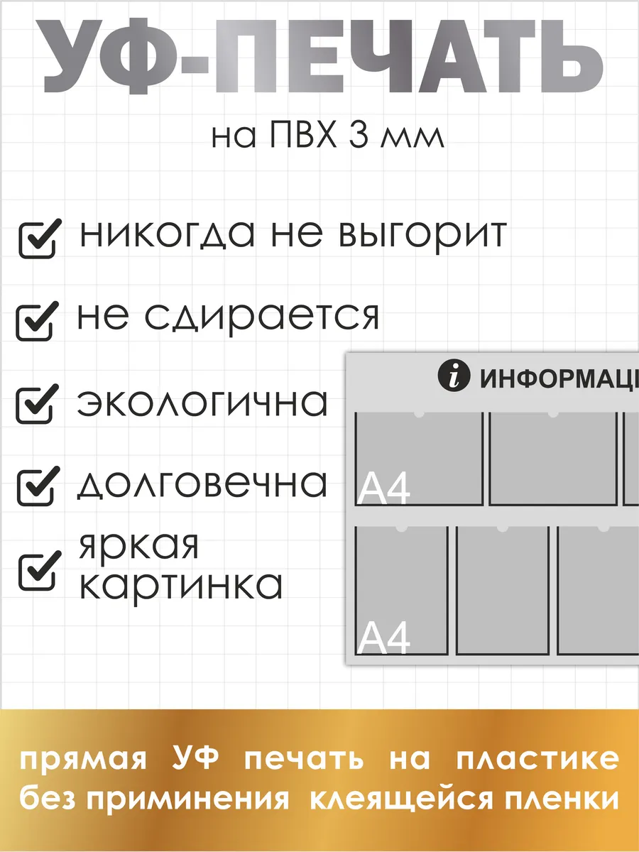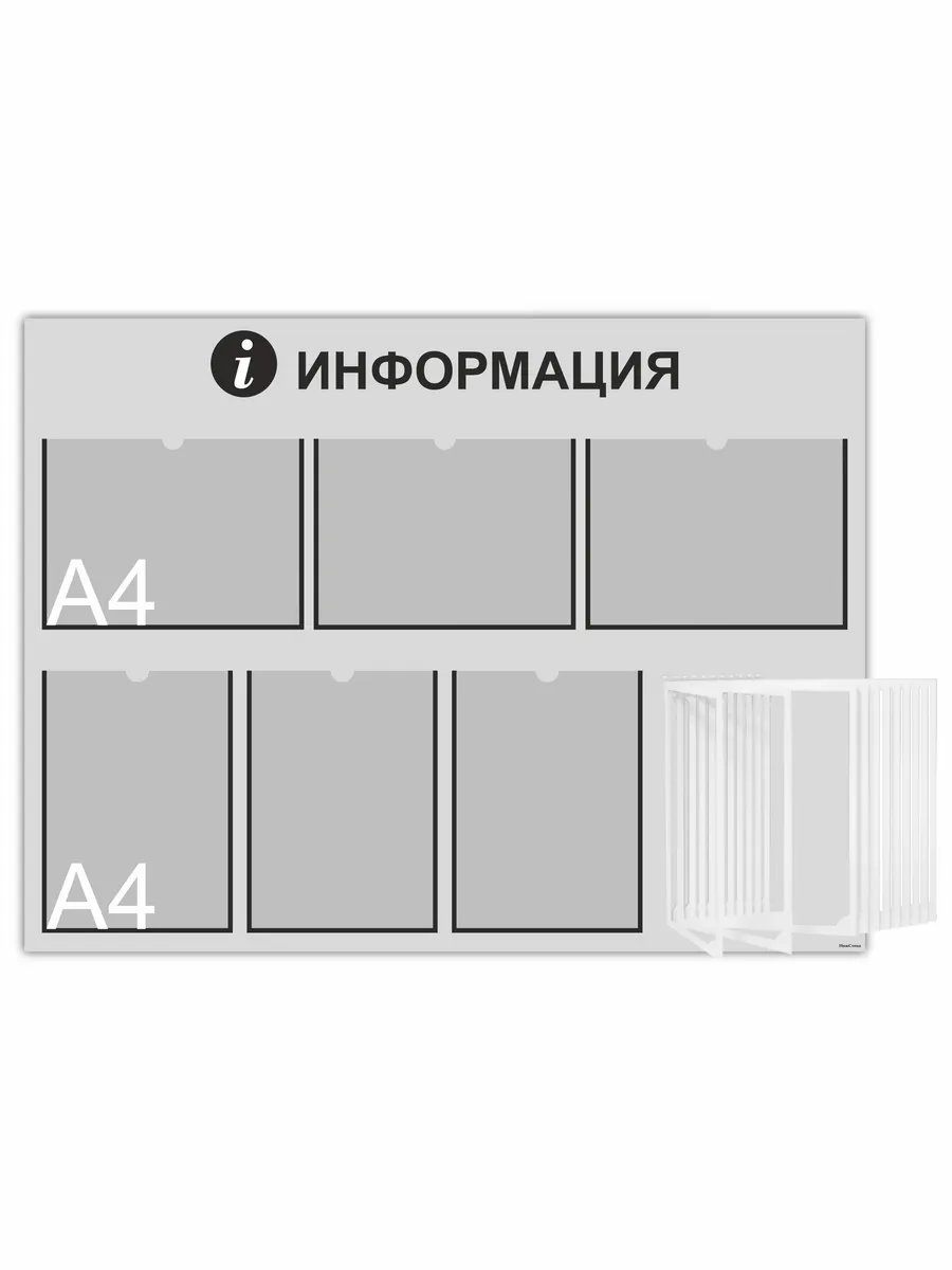 Стенд информационный с 8 карманами (восемь) А4, серый с перекидной системой на 10 карманов с вертикальными и горизонтальными карманами. Информационный стенд является универсальным решением и отлично подойдет для школы, детского сада, ДОУ, СНТ, родителей, гостиницы, хостела, магазина, маникюрного салона, салона красоты, поликлиники, больницы, медицинсих клиник. Стенд информация сделан из не тяжелого пластика, что позволяет легко установить стенд информация на стену. Информационную табличку с прозрачными карманами можно использовать как стенд информационный в школу. С обратной стороны информационного стенда есть удобндвусторонняя клейкая лента для легкой установки на стену помещения, класса. Данная конструкция может быть также использована как стенд для родителей. Стенды для детского сада как правило имеют яркие раскраски, но минималистичный информационный стенд является более грамотным решением. Минималистичный дизайн стенда позволяет сделать упор непосредственно на информацию, размещенную в прозрачных карманах, и не отвлекать от нее пестрыми цветами самого стенда. Подойдет как информационный стенд в детский сад, а также как стенд информация в любое другое государственное и частное учреждение. Информационный стенд с карманами, это классическое решение любых задач по взаимодействию с посетителями. Стенд информация позволяет сократить время решение задач информирования родителей и посетителей, путем размещения ответов на частые вопросы в информационный карманы настенного стенда. Размещение информационного стенда на стене, позволяет решить широкий спектр задач. Стенды для начальный школы, как и для старших классов широко используются в системе российского образования.