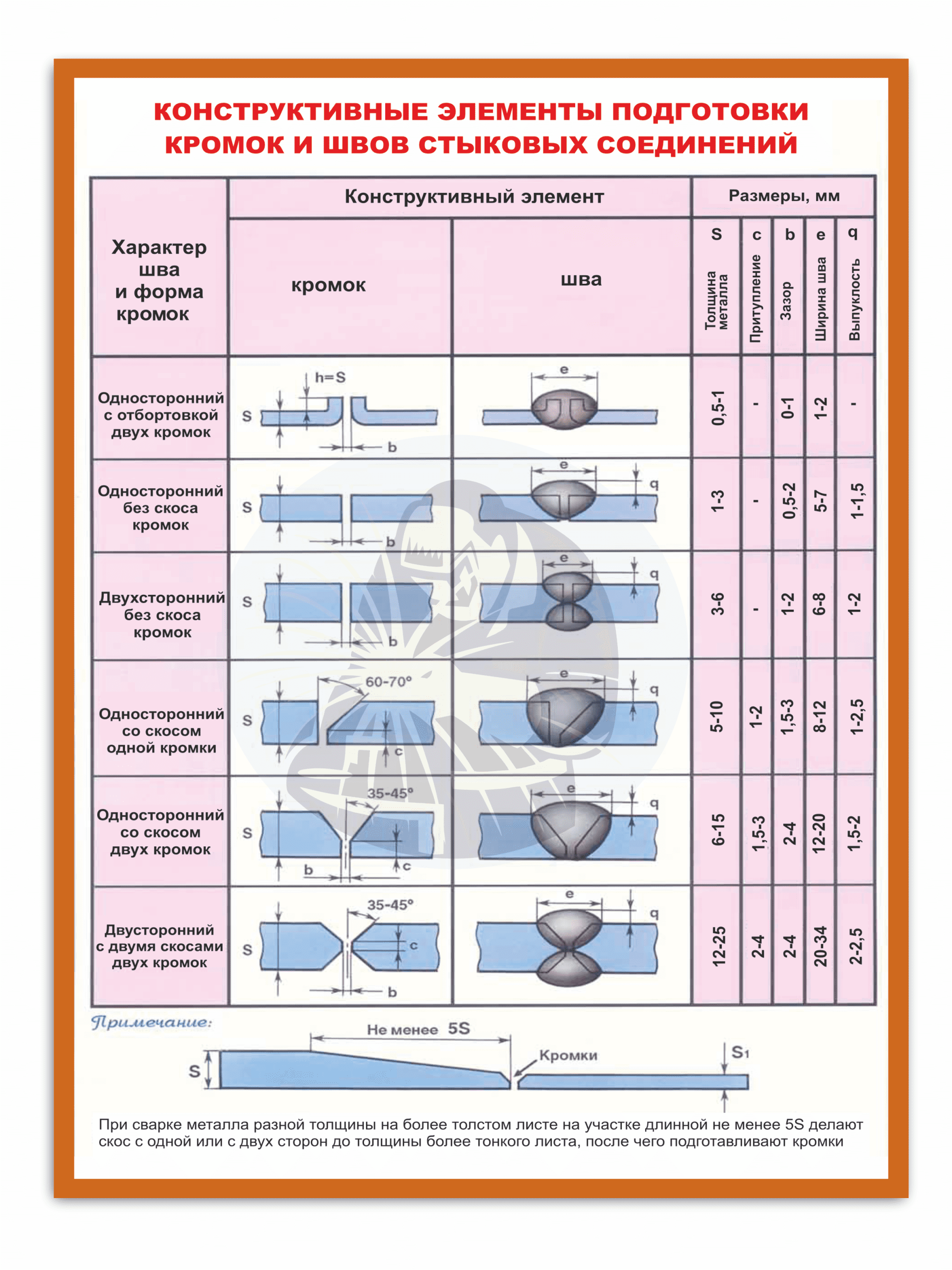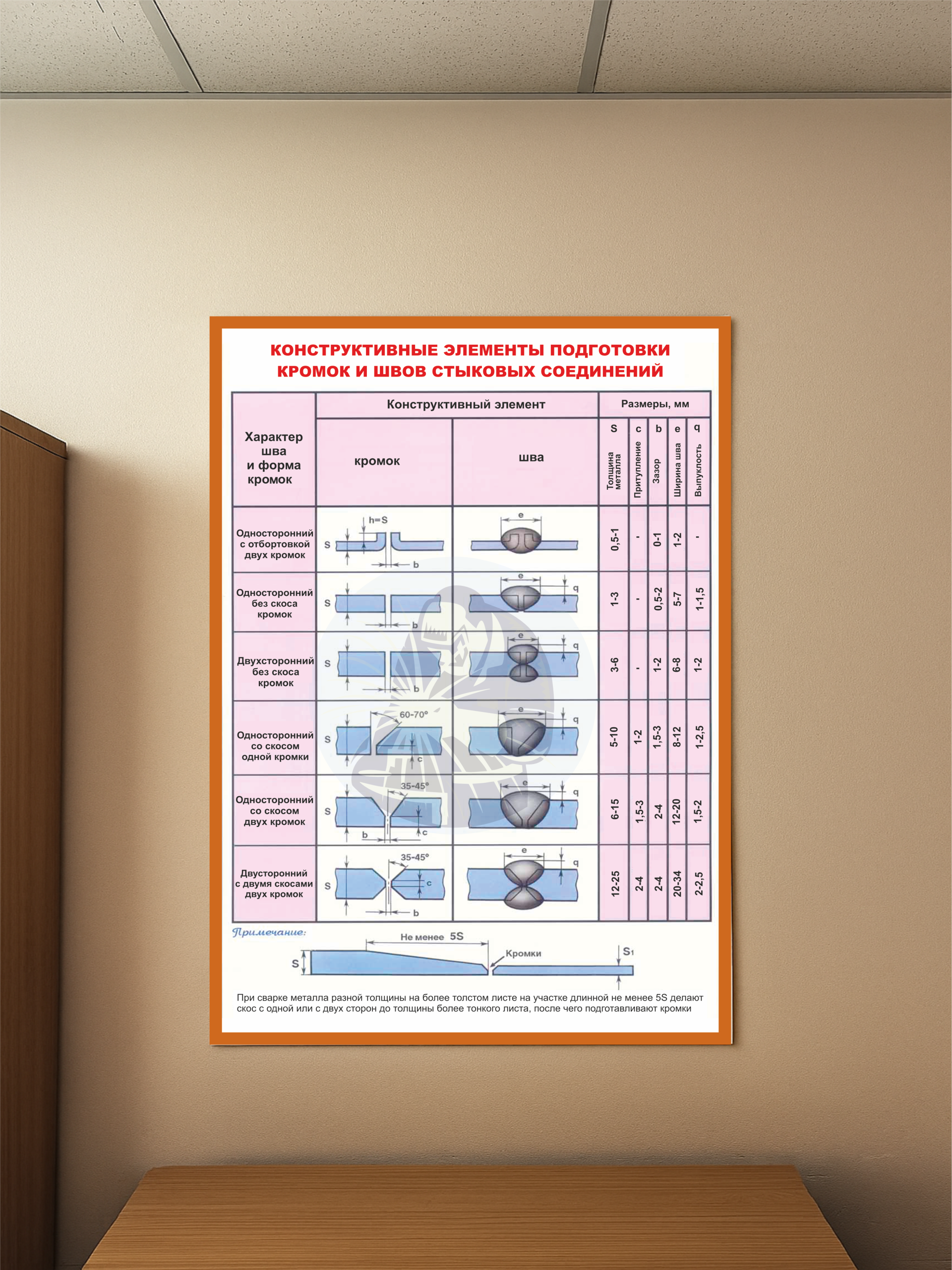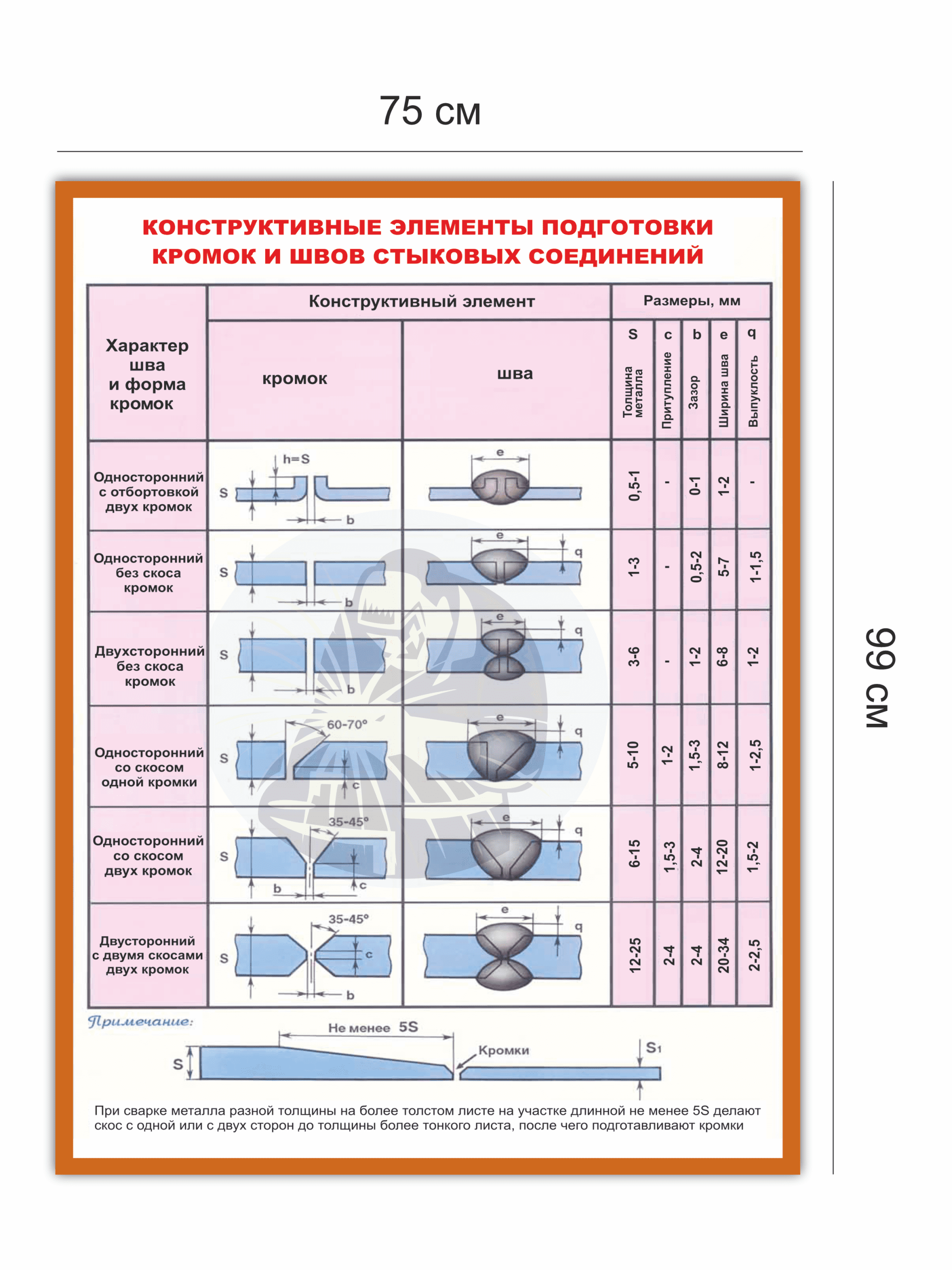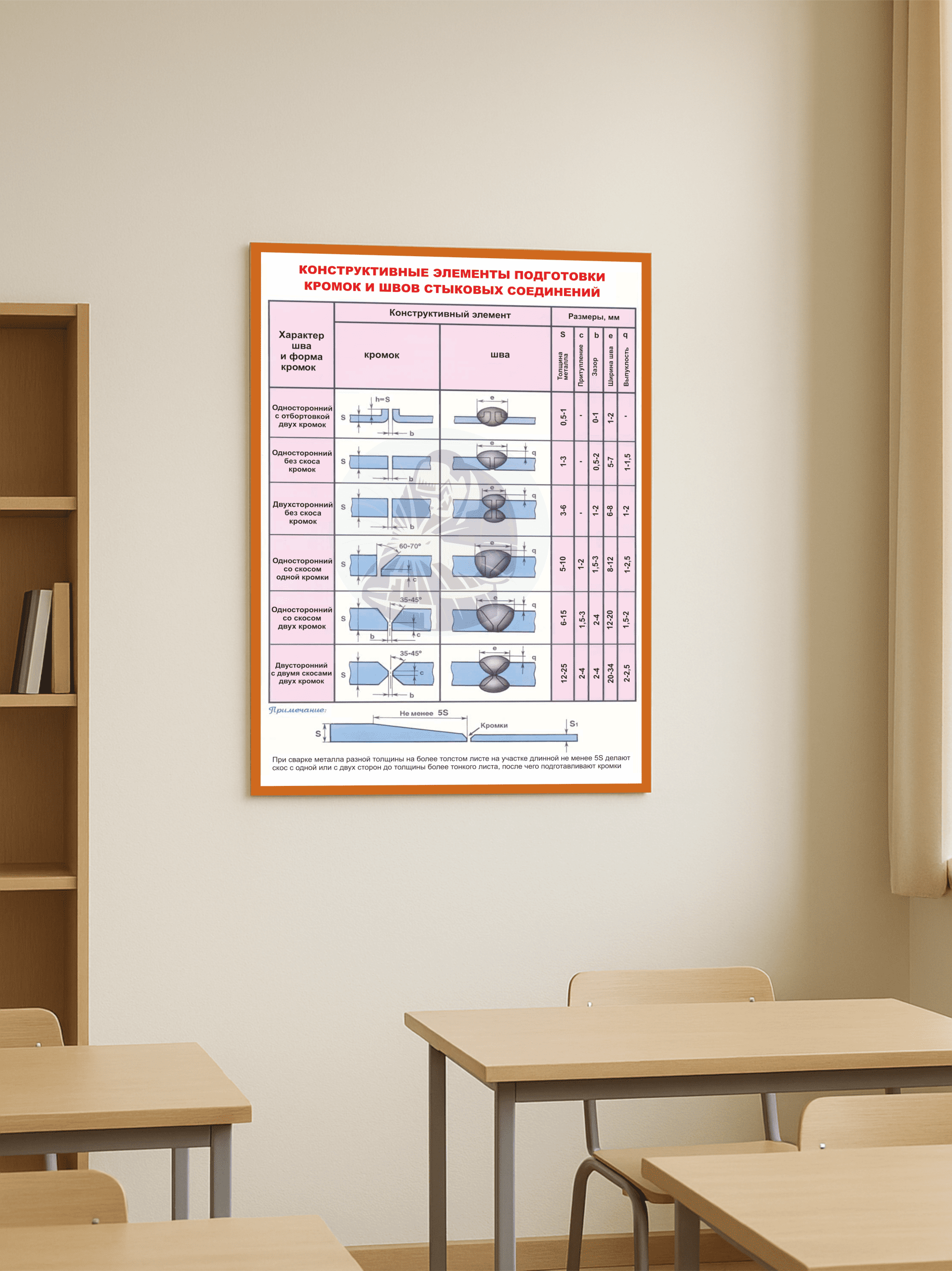 Учебный стенд «Конструктивные элементы подготовки кромок и швов стыковых соединений» предназначен для наглядного изучения типов сварных соединений и способов подготовки кромок. На плакате представлены различные виды стыковых швов — односторонние, двусторонние, со скосом одной или двух кромок, с отбортовкой и без. Каждый тип снабжён подробной схемой конструкции шва, указанием углов, зазоров, выпуклости и размеров в миллиметрах.