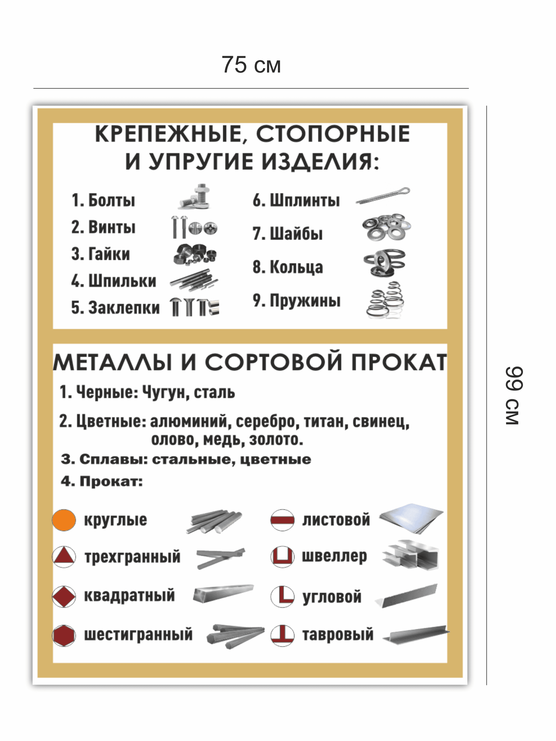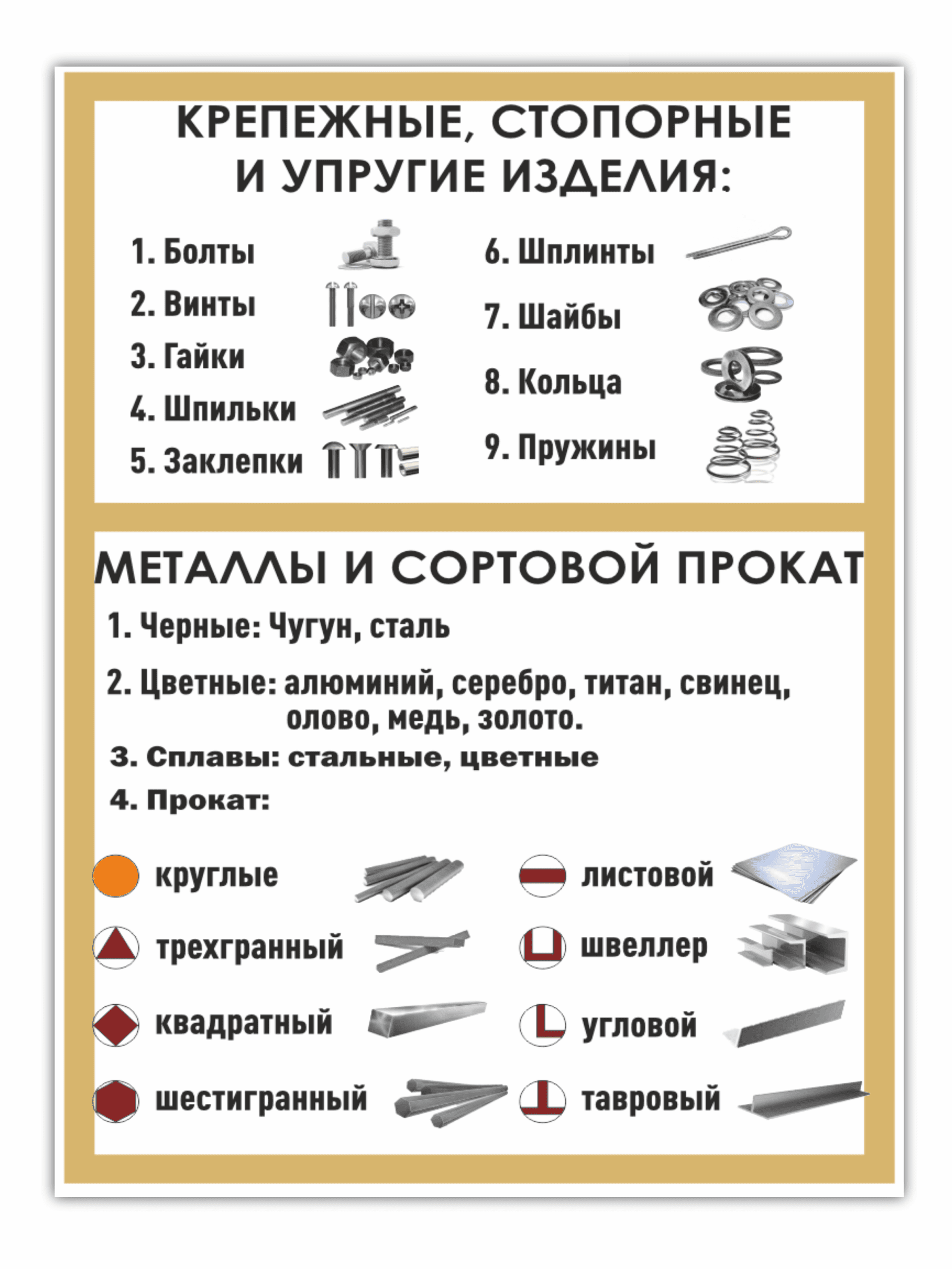 Учебный стенд «Крепежные, стопорные и упругие изделия. Металлы и сортовой прокат» — это наглядное пособие для изучения видов металлических изделий, крепежных элементов и сортового проката. На плакате представлены изображения и названия деталей: болты, винты, гайки, шпильки, шайбы, кольца, пружины, заклепки, шплинты, а также виды металлов и проката — чёрные, цветные, сплавы, листовой, швеллерный, тавровый, угловой и другие.