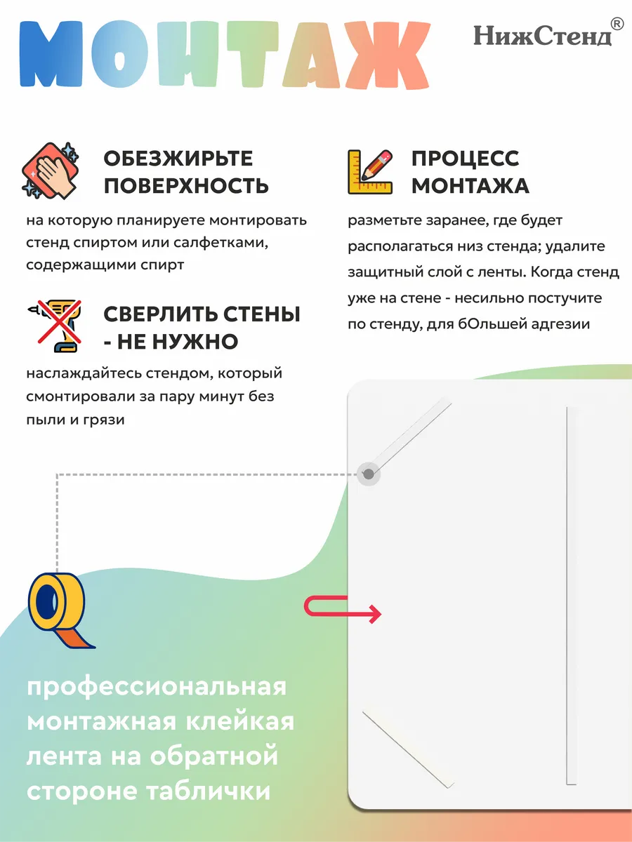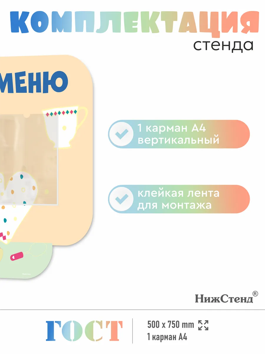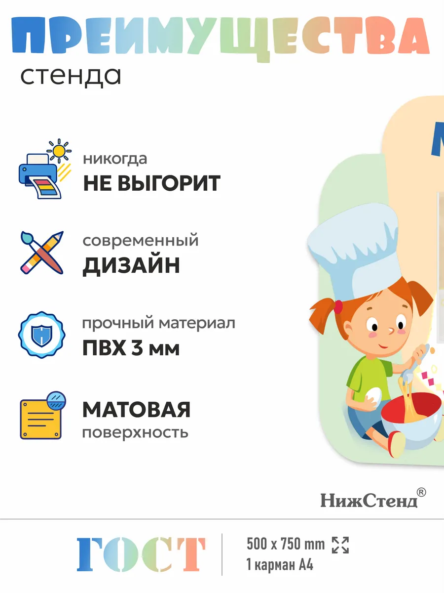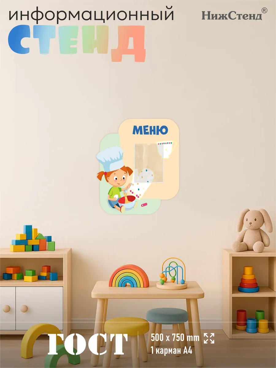 Стенд информационный в садик Меню изготовлен из ПВХ 3мм с приминением технологии прямой УФ печати по пластику, что делает стенд устойчивчм к выгоранию и влажности, так же стенд можно протирать от загрязнений влажно тряпкой или салфетками. На стенде – вертикальный карман А4. На обратной стороне стенда – двусторонняя клейкая лента для монтажа стенда на стену без сверления. Размер стенда – 50х75 см. Стенды для школы. Стенды для детского сада. Стенды для детей это неотъемлемая часть помещений, в которых проводят время школьники и дошкольники. Детский стенд помогает малышам познавать мир, а школьникам и дошкольникам знакомится с историей и получать необходимые знания. Детские стенды яркие и обязательно привлекут к себе внимание. Стенд меню обязательно понравится своим ярким дизайном. На стенде имеется кармашек А4 для размещения в нем информации о питании на день. Такое оформление детского творчества придаст образовательному процессу атмосферу гармонии, веселья и повысит настроение малышей. Все изображения устойчивы к влаге и выгоранию, при необходимости можно мыть. Также изображения не сдираются и не царапаются. Все стенды имеют сертификат ГОСТ и изготовлены из нетоксичных материалов. Наши информационные стенды обязательно должны быть в Вашем интерьере! Если у Вас остались вопросы, задайте нам их и мы Вам обязательно ответим! Будем признательны, если после покупки Вы оставите нам отзыв с фото! Будем рады видеть Вас среди наших покупателей!