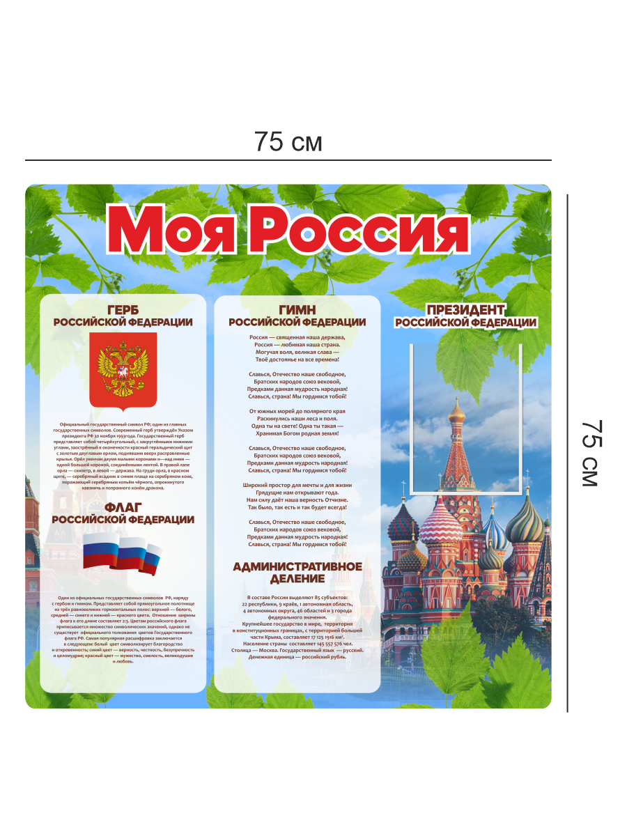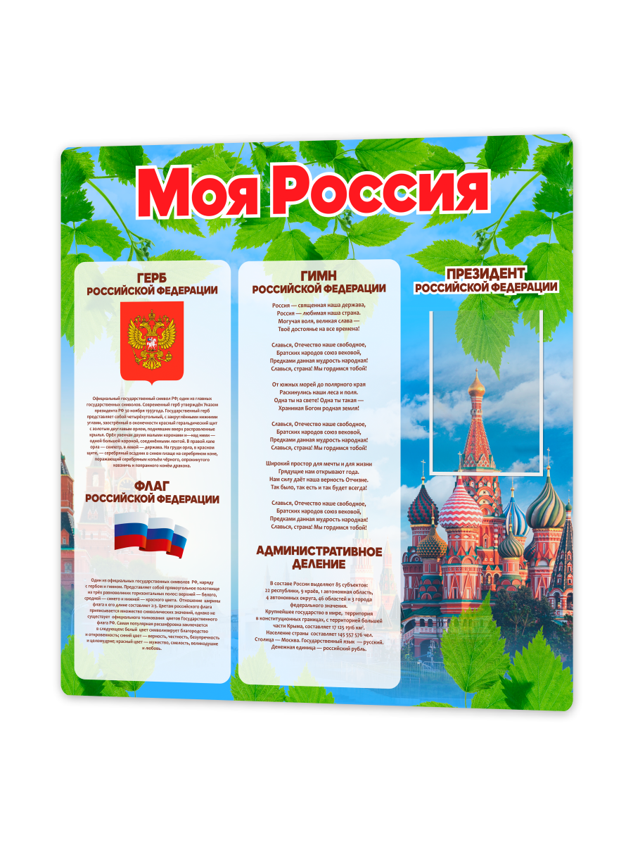 Стенд предназначен для школ, образовательных учреждений и организаций, обеспечивая визуальное представление государственной и региональной символики, способствуя патриотическому воспитанию и формированию уважительного отношения к историческому наследию страны.