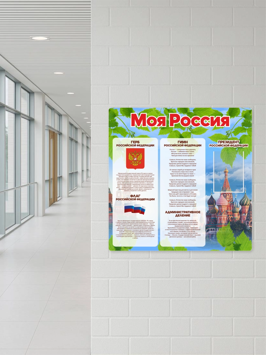 Стенд выполнен иэ экологически чистого материала – ПВХ 3 мм, с яркой и детализированной печатью высокого качества, которая не выгорает со временем. Не боится воды, стенд можно мыть при необходимости. Легко монтируется на стену с помощью специального крепкого двустороннего скотча, который идет в комплекте.