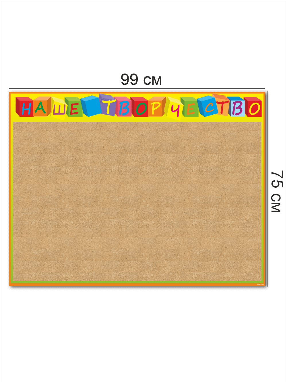 Стенд Наше творчество в детский сад размером 99х75 см – выполнен из пластика ПВХ 3мм с применением технологии прямой УФ печати по пластику, что делает изображение на стенде устойчивым к выгоранию, а также стенд при необходимости можно мыть влажной тряпкой или салфетками. На обратной стороне стенда – двусторонняя клейкая лента для монтажа стенда на стену без сверления. Размер пробкового покрытия 960х612 мм. Товар имеет сертификат ГОСТ и изготовлен из негорючих нетоксичных материалов. Пробковая доска – это универсальное решения для размещения большого количества информации с возможностью оперативной замены, благодаря покрытию из пробки, на которое можно закреплять листы с информацией на канцелярские кнопки