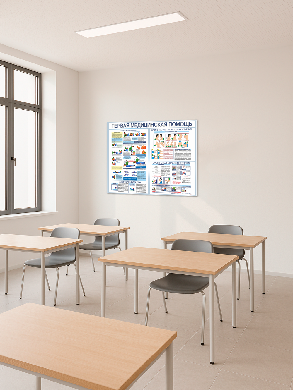 Стенд предназначен для школ, организаций и общественных мест, обеспечивая доступ к важной информации о приемах оказания первой медицинской помощи и способствуя подготовке сотрудников и посетителей к действиям в экстренных ситуациях.