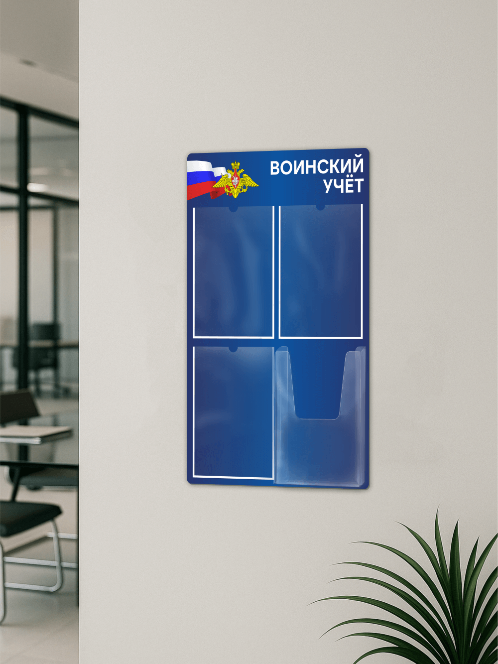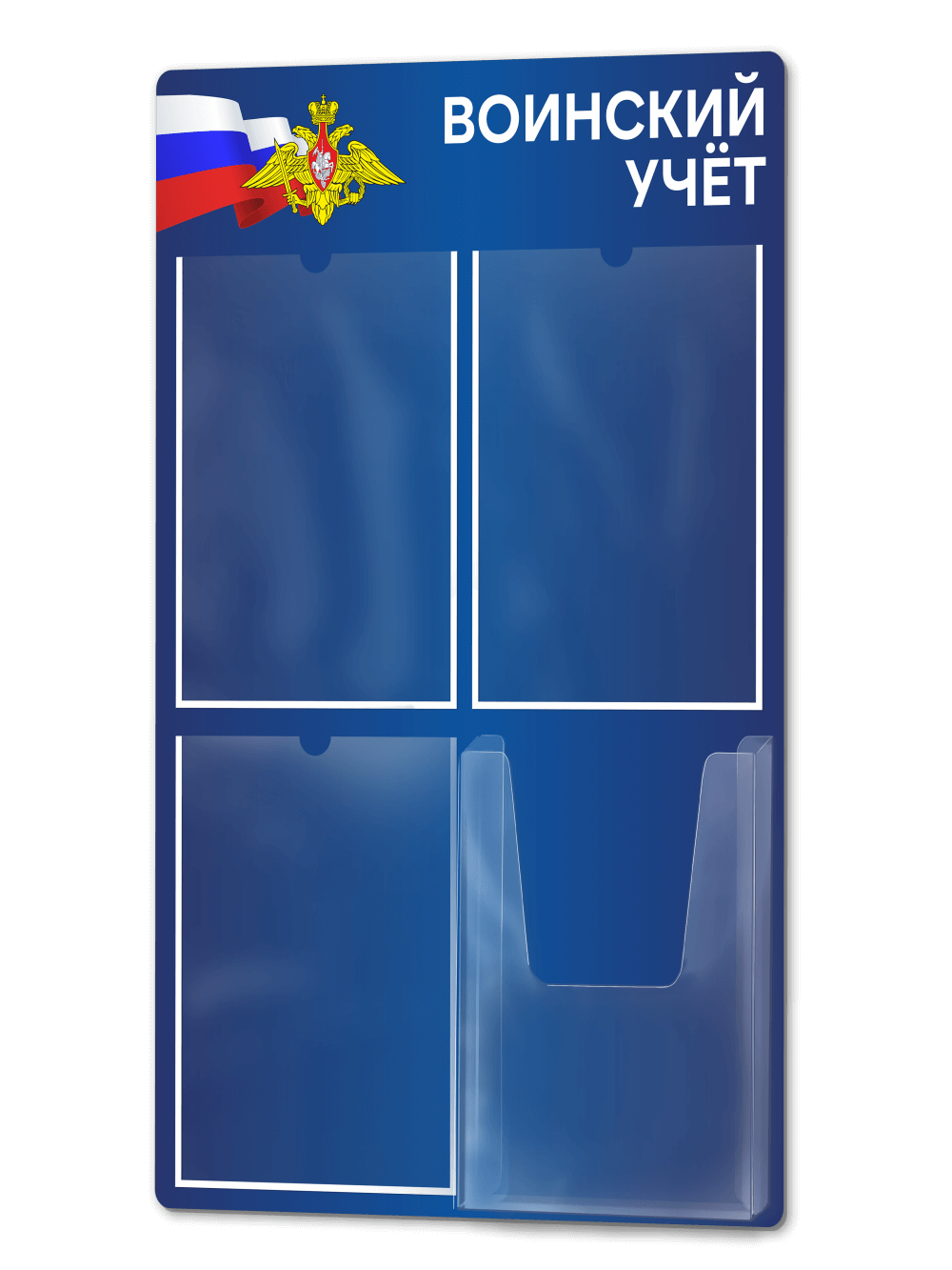 Информационный стенд «Воинский учёт» размером 75×50 см изготовлен из прочного ПВХ 3 мм и оснащён четырьмя прозрачными карманами А4. Один из карманов выполнен объёмным, что позволяет удобно размещать брошюры, журналы, инструкции, папки и другие материалы повышенной толщины.