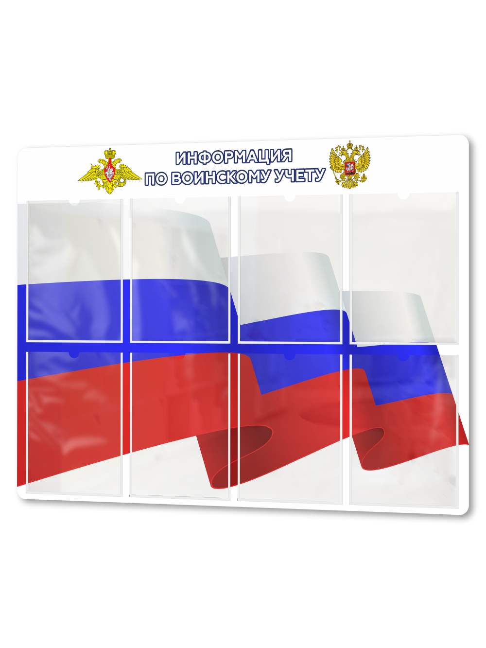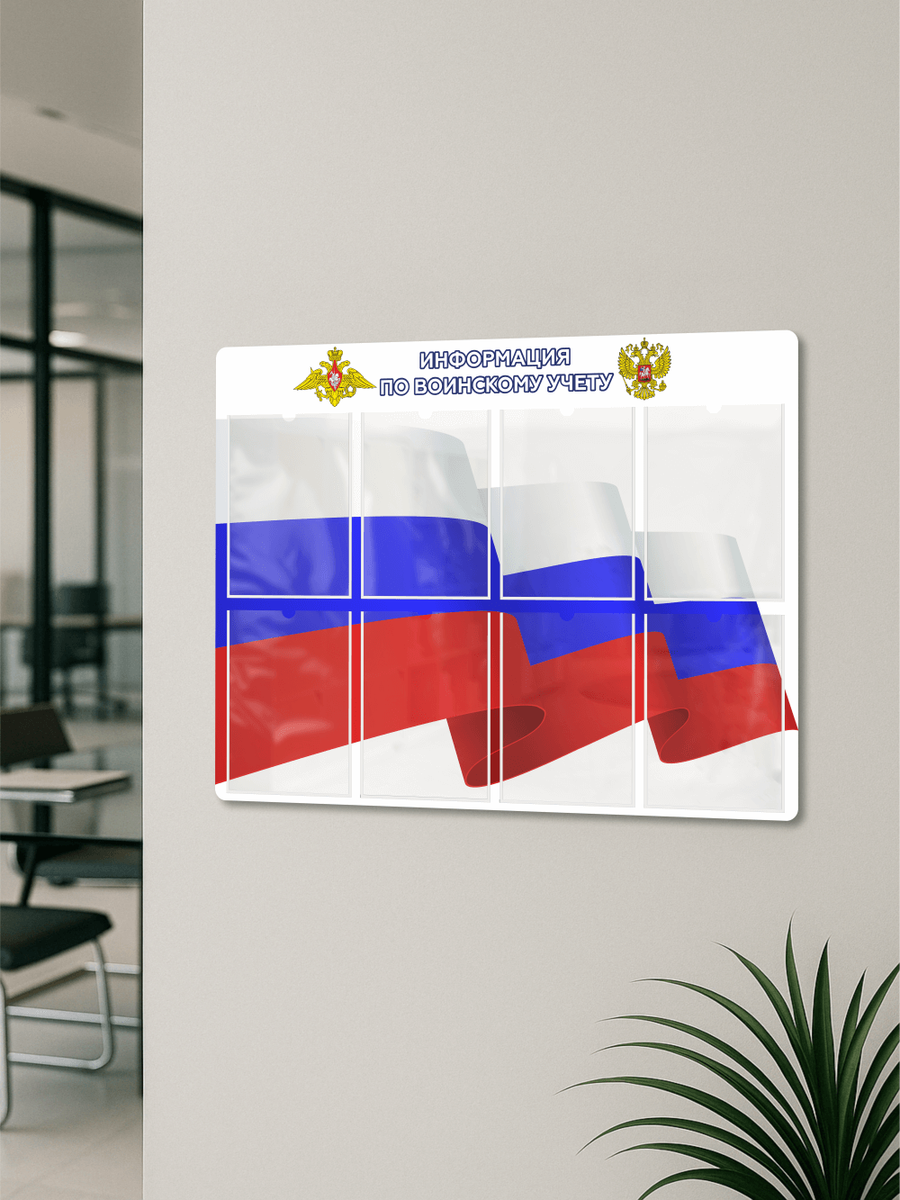 Стенд для информирования и наглядной агитации населения, проведения мобилизации и бронирования граждан. Информационный стенд для организации с 8 плоскими карманами А4 служит для размещения актуальной и полезной информацию о правилах ведения воинского учета и проведения мобилизационной деятельности. Материал конструкции стенда: ПВХ пластик белый – прямая УФ печать. Лаконичный и современный дизайн гармонично впишется в любой интерьер.