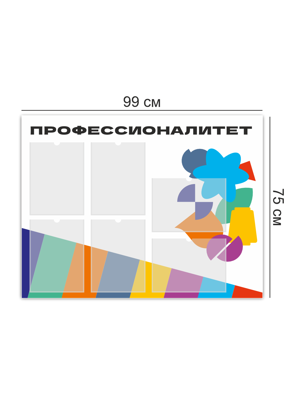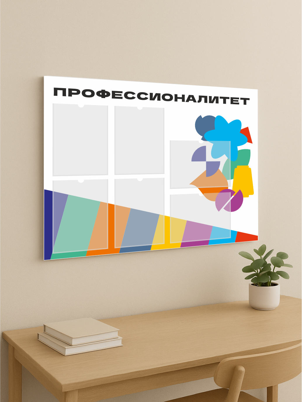 Информационный стенд «Профессионалитет» предназначен для размещения актуальных материалов о профессиях, образовательных программах и направлениях подготовки. Яркий современный дизайн и удобные прозрачные карманы позволяют легко обновлять информацию и поддерживать оформление в едином стиле.