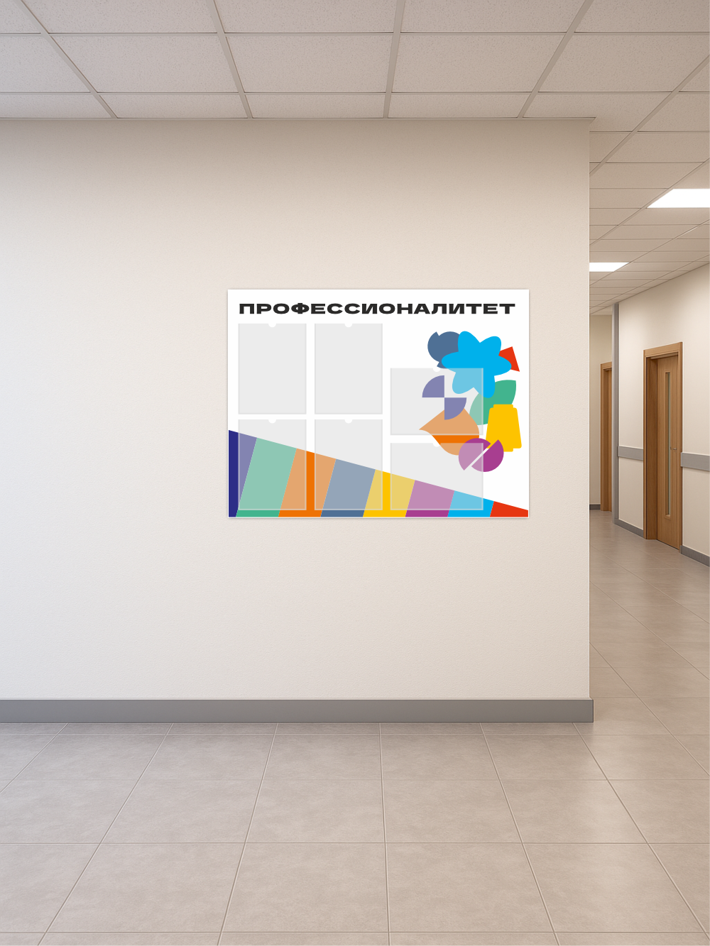 Дизайн стенда выдержан в фирменных цветах проекта «Профессионалитет», что делает его актуальным решением для учебных заведений и центров профобразования.