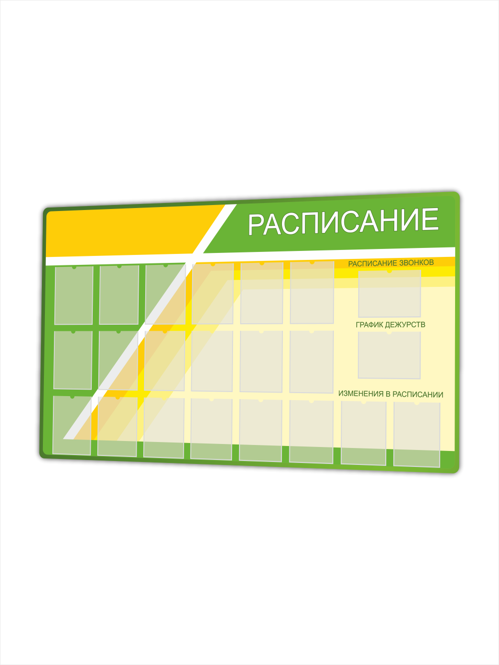 Конструкция включает 20 вертикальных карманов формата А4 для размещения расписания по классам или группам и 2 горизонтальных кармана формата А4 для информации о звонках и изменениях.