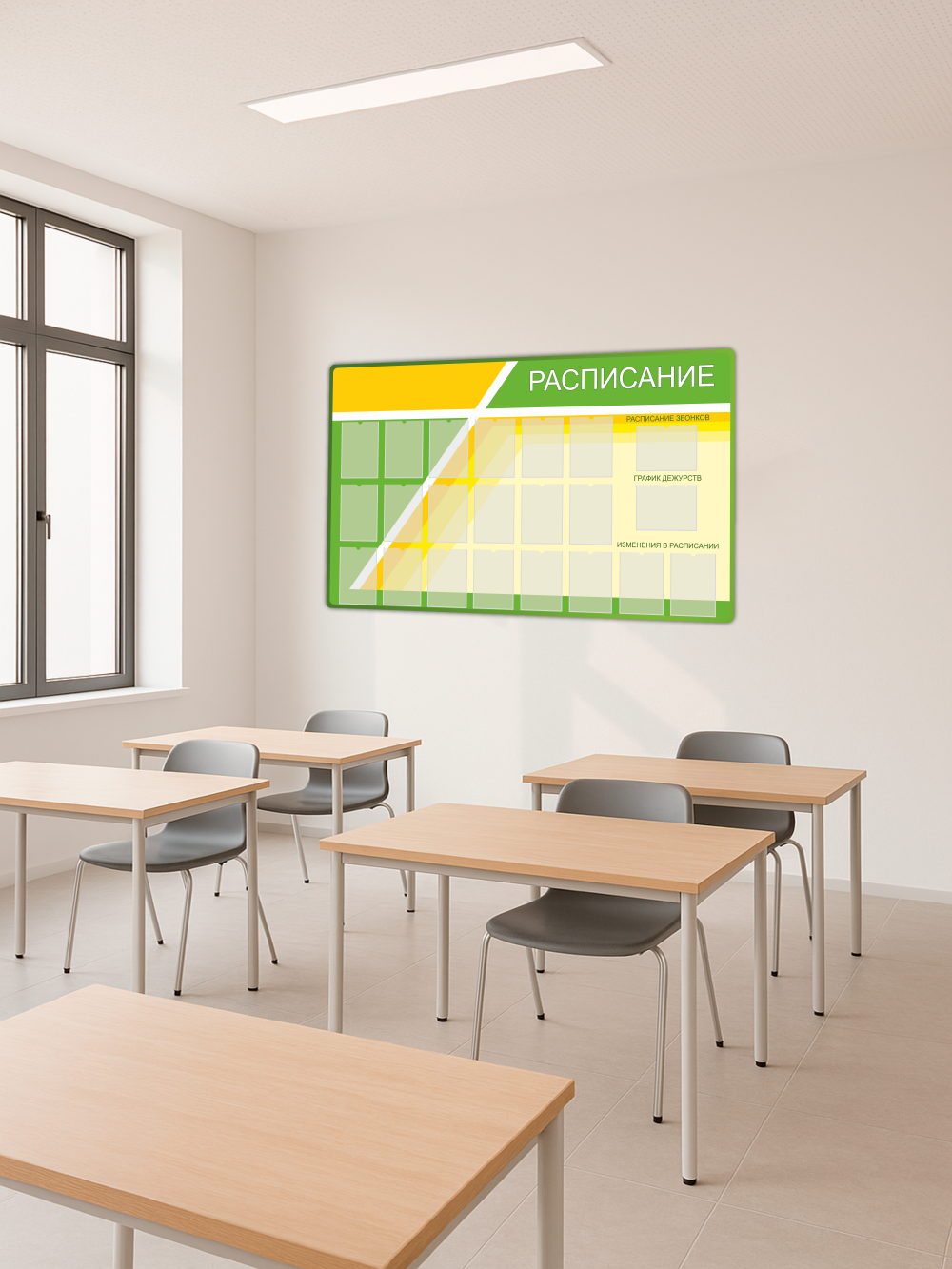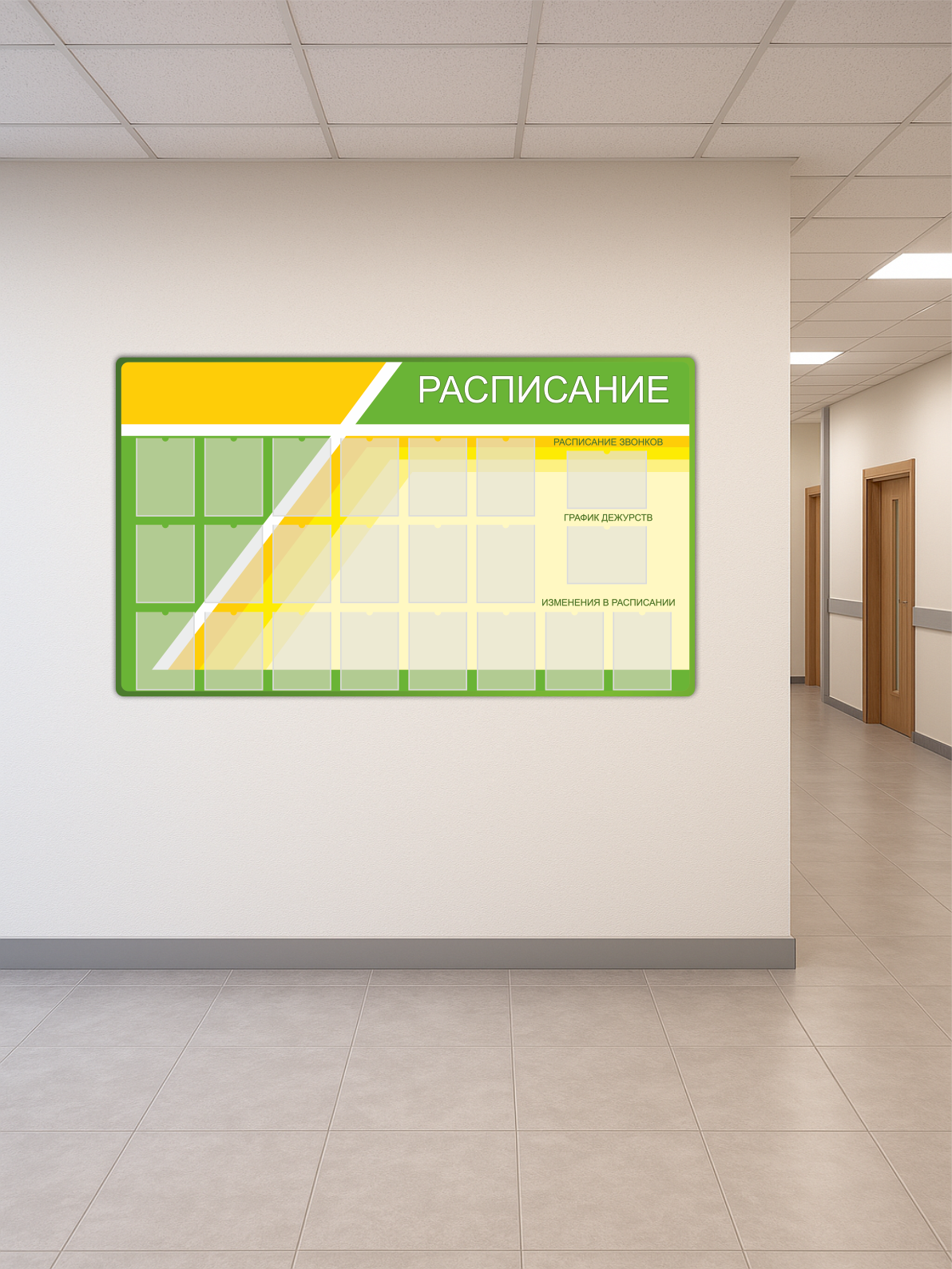 Большой информационный стенд «Расписание» предназначен для размещения актуального расписания уроков, звонков, дежурств и изменений. Яркое оформление и продуманная структура делают стенд удобным и наглядным для учеников и преподавателей.
