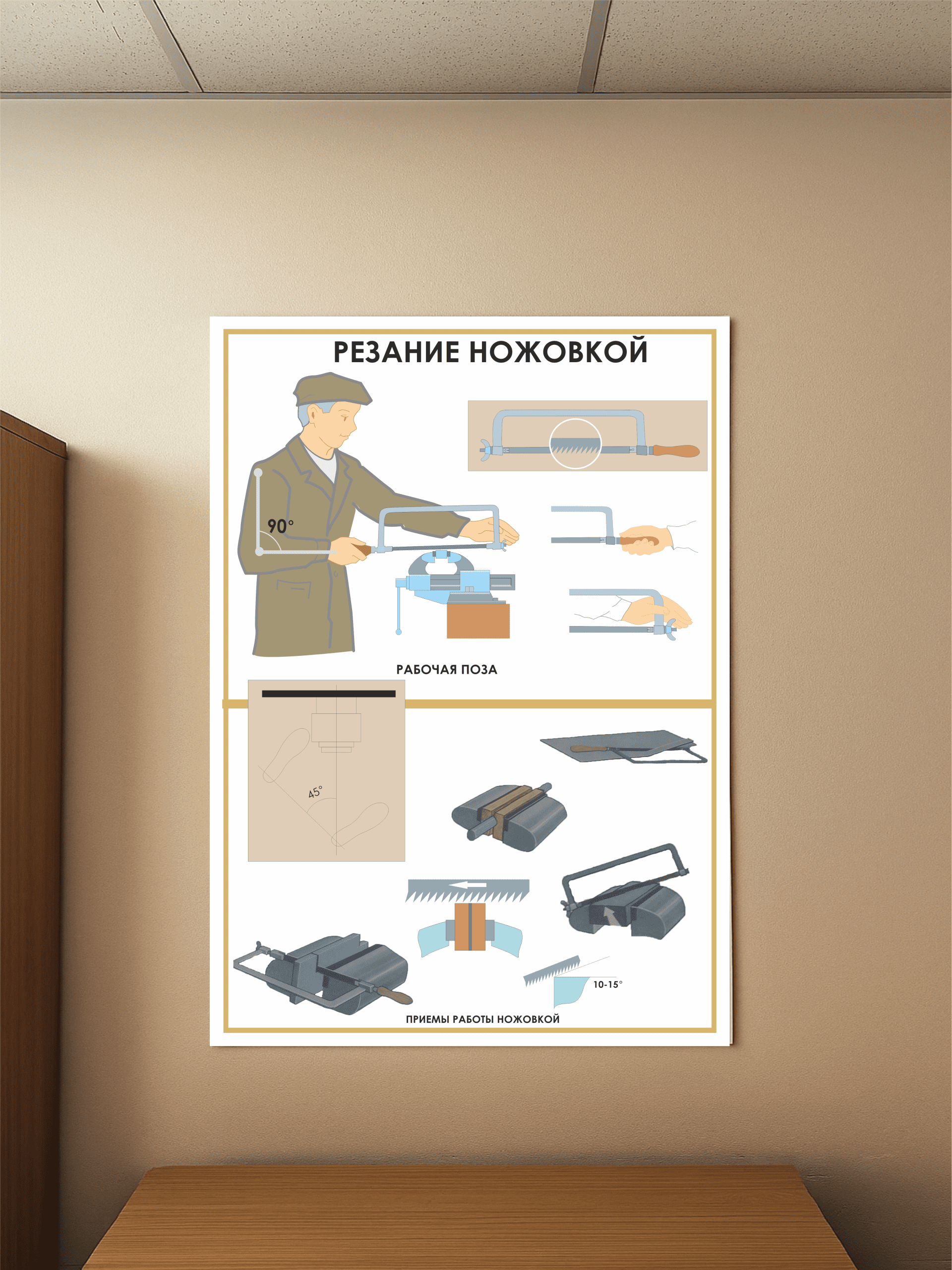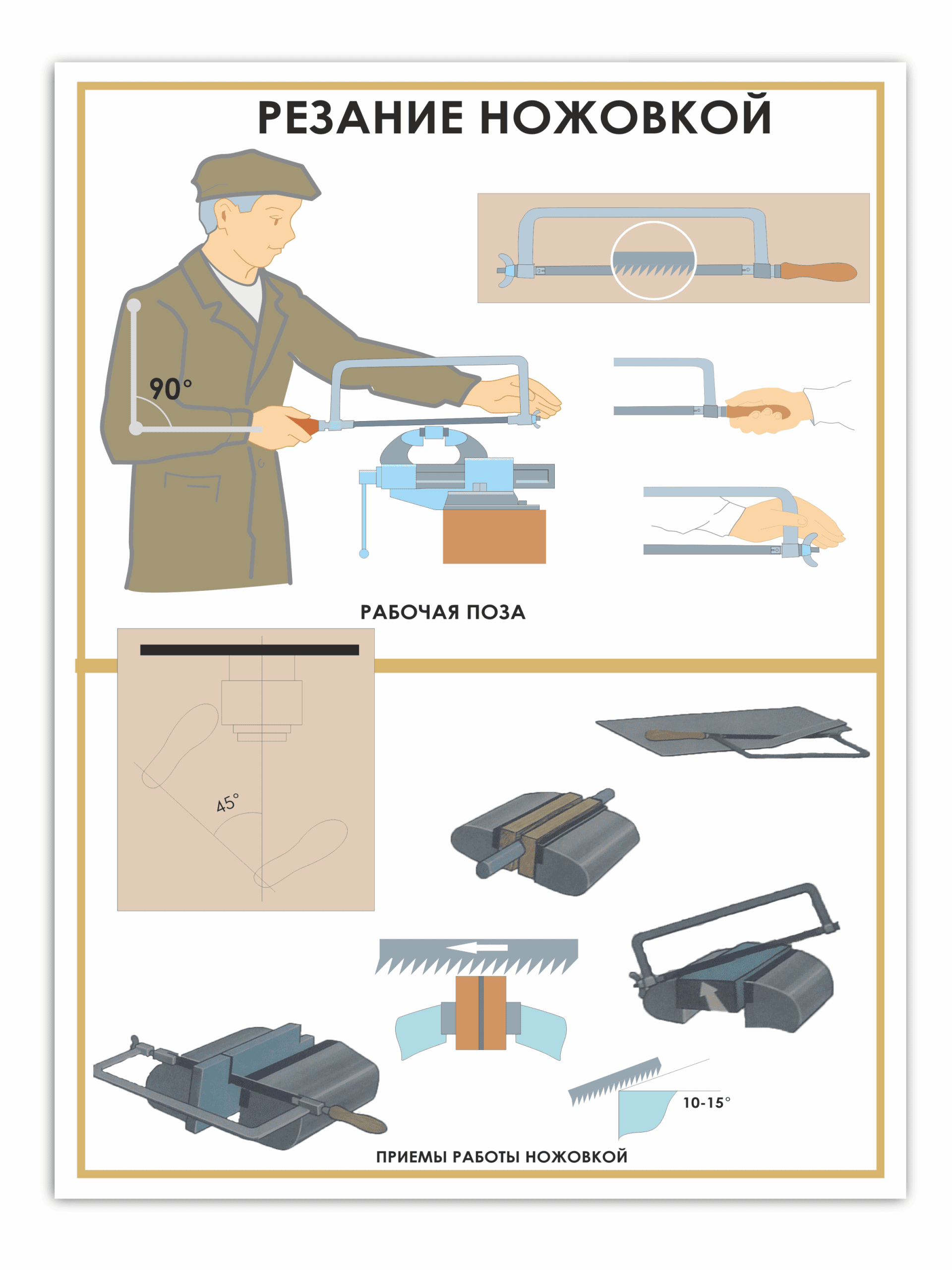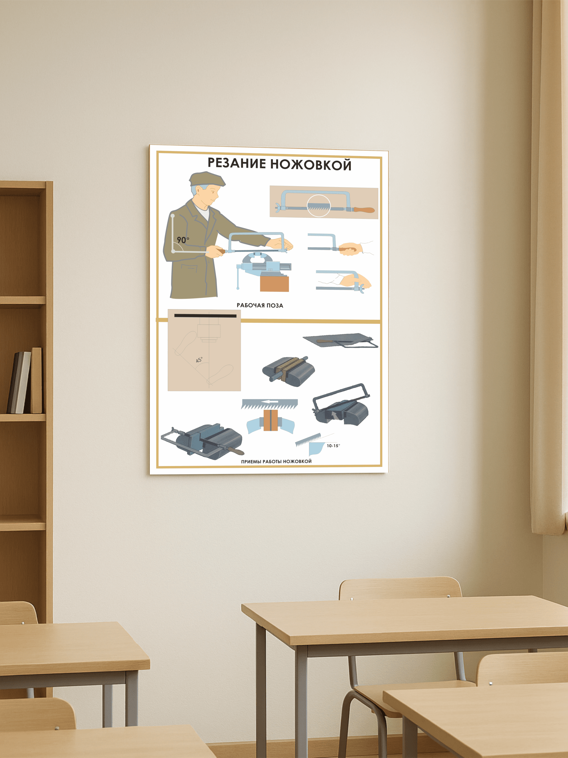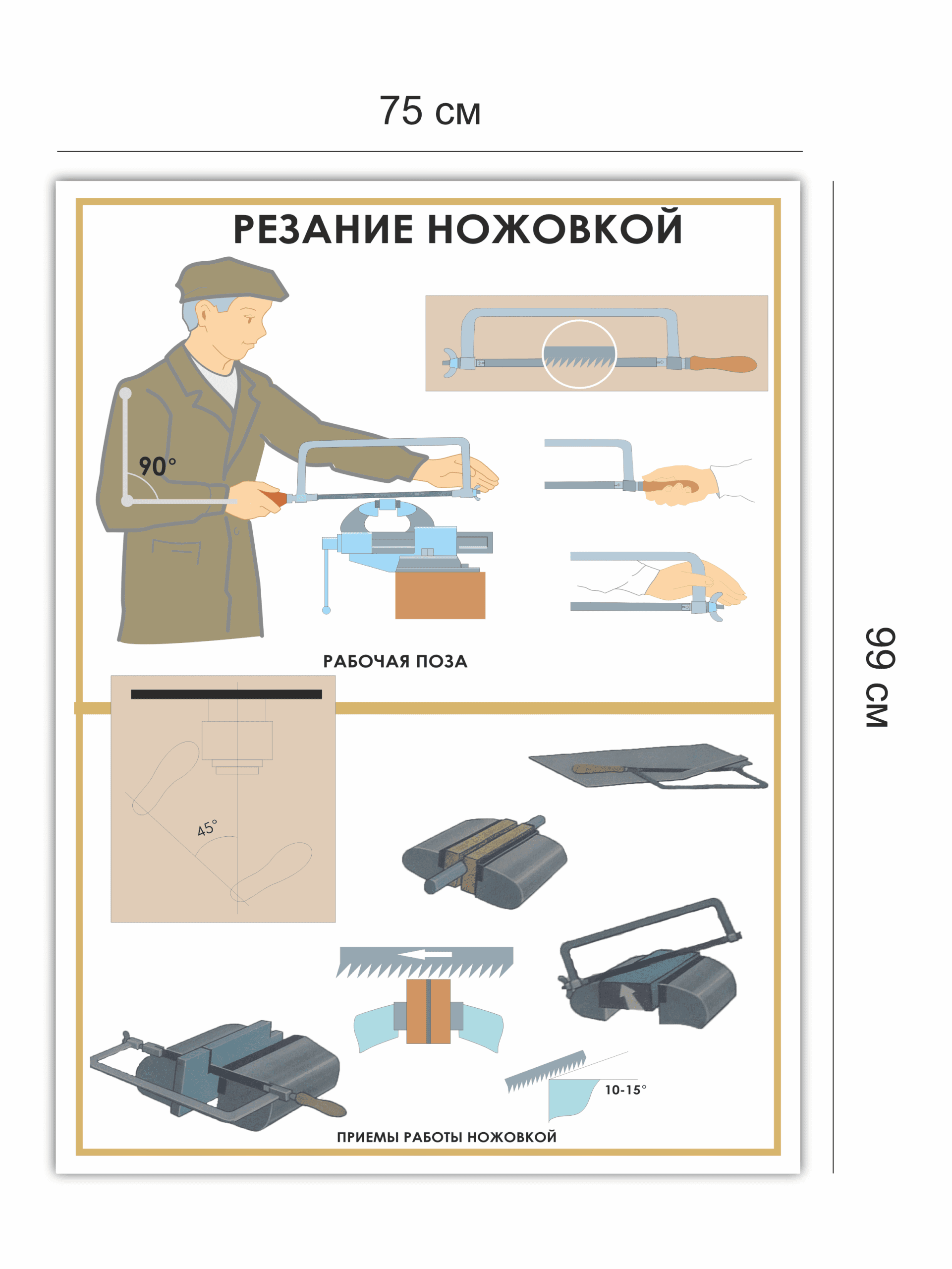 Учебный стенд «Резание ножовкой» — это наглядное пособие, предназначенное для изучения приёмов ручной обработки металлов и других материалов. На плакате подробно показаны устройство ножовки, рабочая поза при пилении, угол наклона полотна и основные приёмы работы ножовкой. Иллюстрации демонстрируют правильное положение корпуса, рук и заготовки при выполнении разрезов.