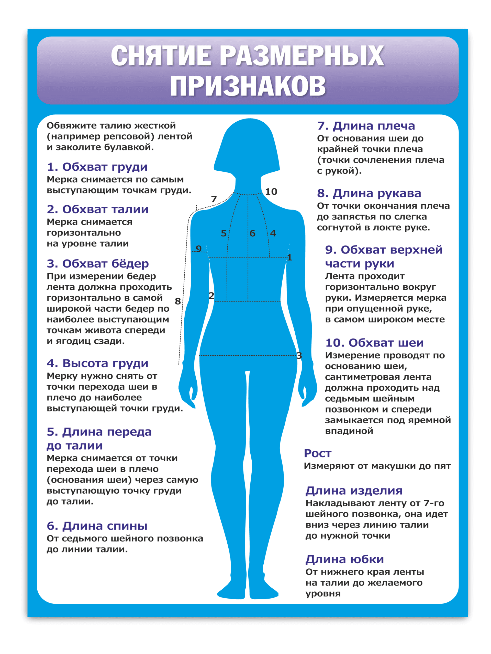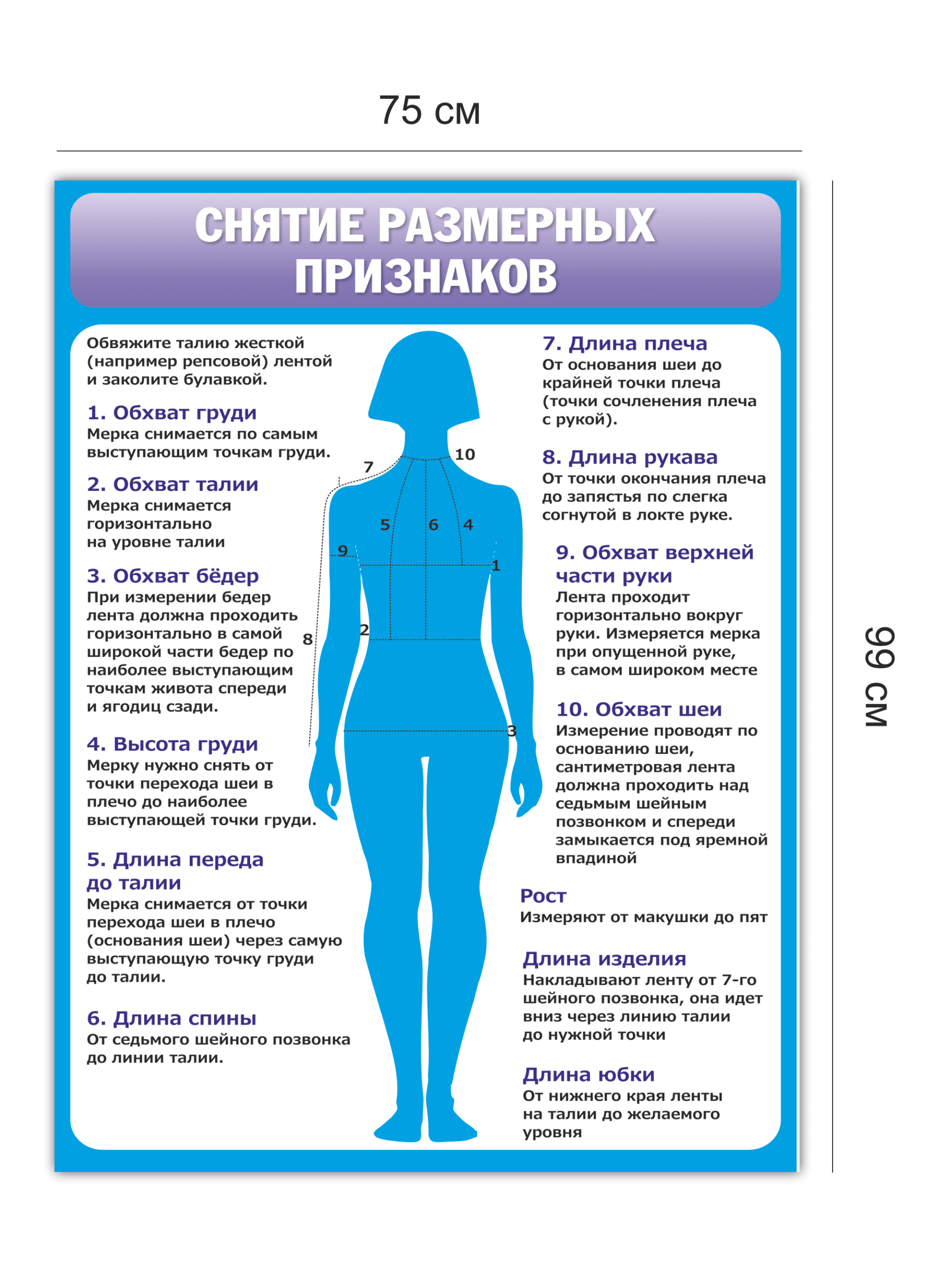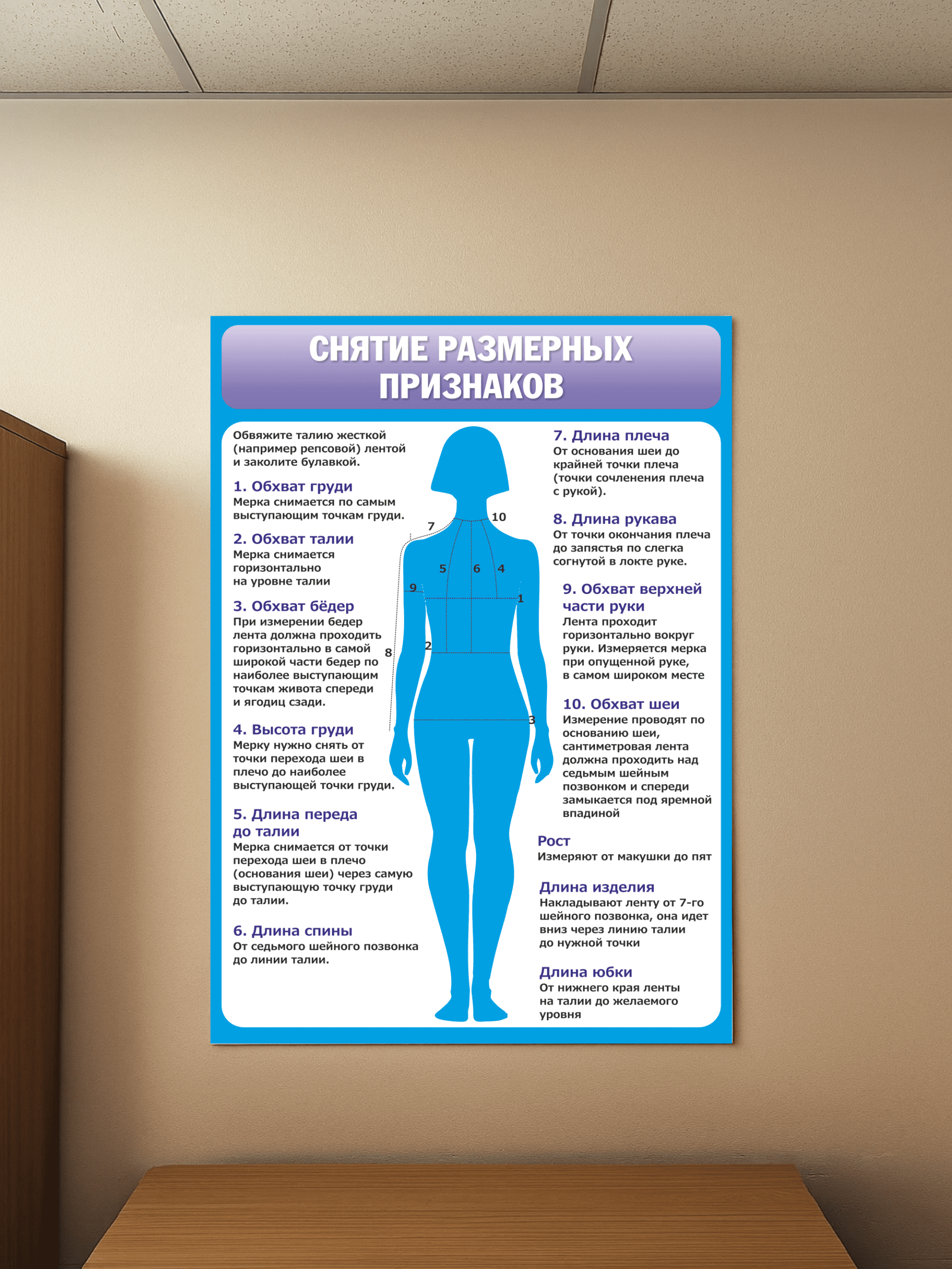 Информационный стенд «Снятие размерных признаков» предназначен для учебных кабинетов технологии, швейных мастерских и учебных центров по дизайну одежды. На стенде подробно показано, как правильно снимать мерки с фигуры: обхват груди, талии, бедер, длину спины, переда, рукава, а также рост и длину изделия.