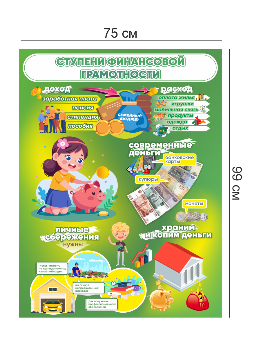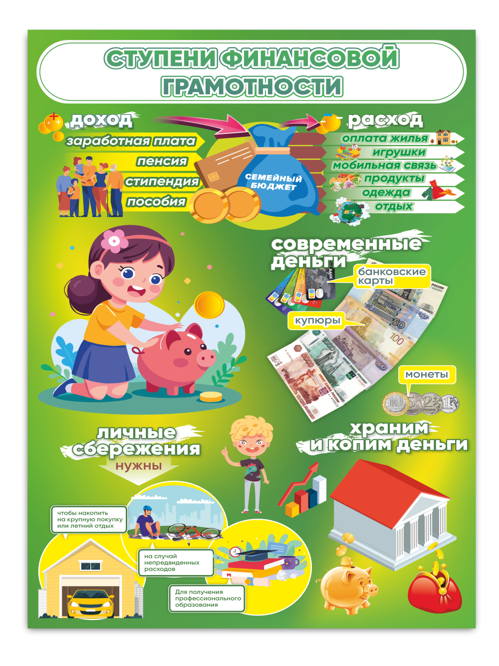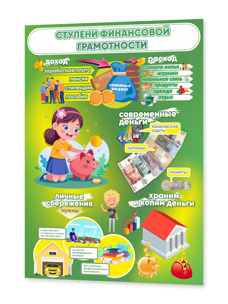 Яркий и познавательный стенд «Ступени финансовой грамотности» поможет детям в доступной форме понять основы обращения с деньгами. Материал наглядно показывает, из чего складывается доход, какие бывают расходы, зачем нужны сбережения и как правильно копить деньги.