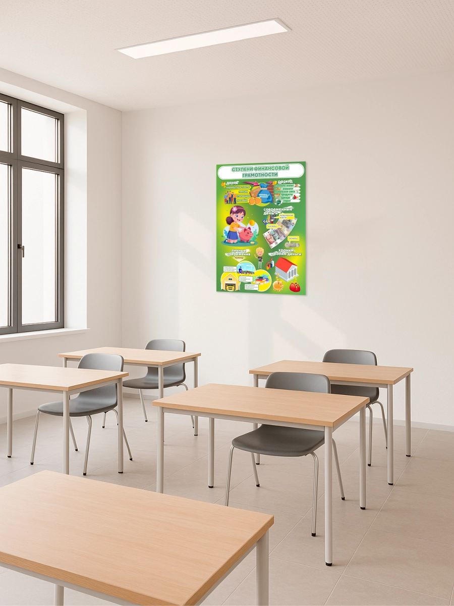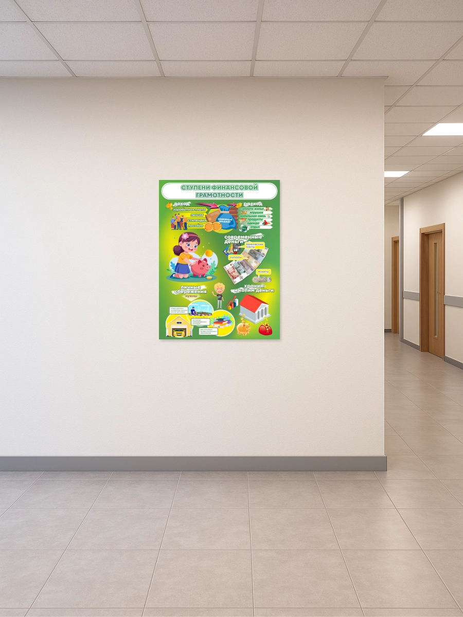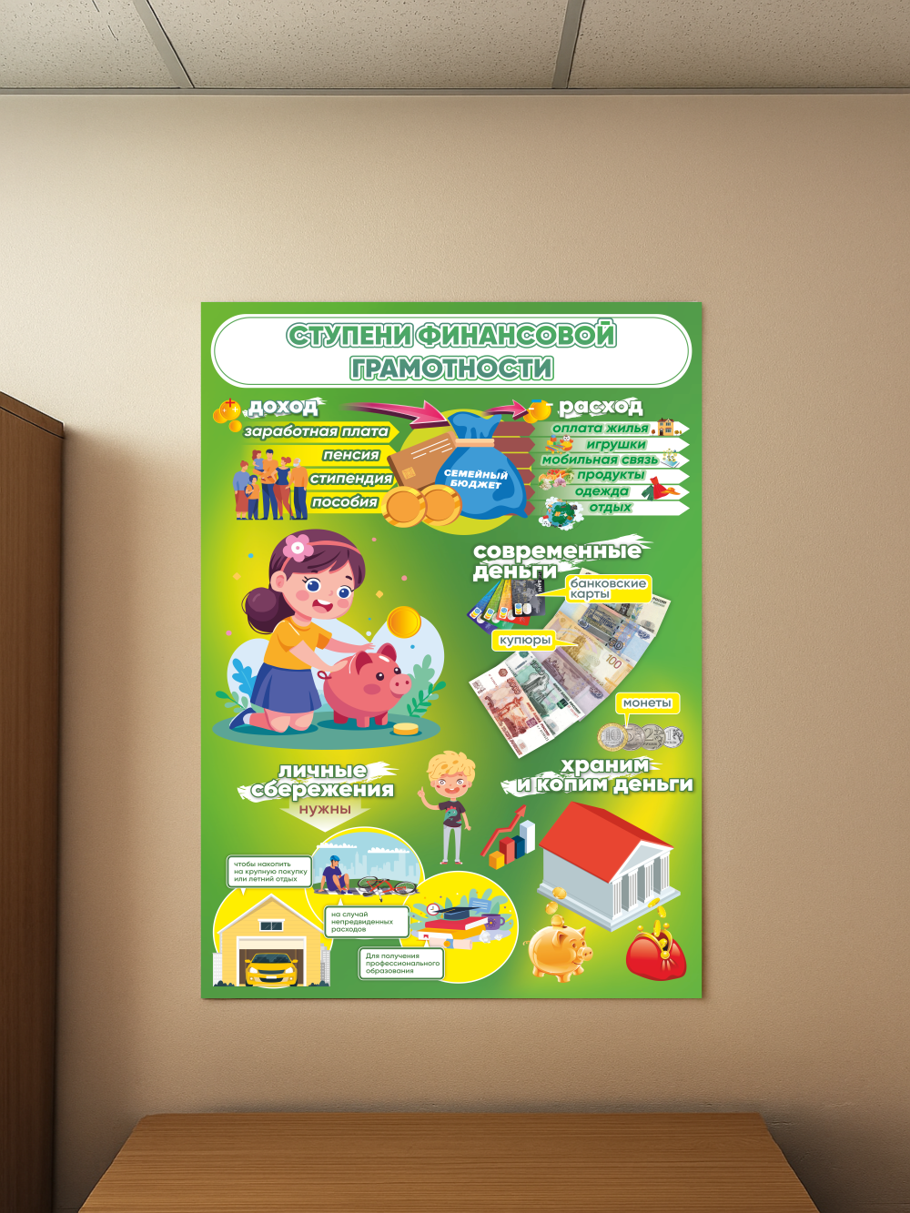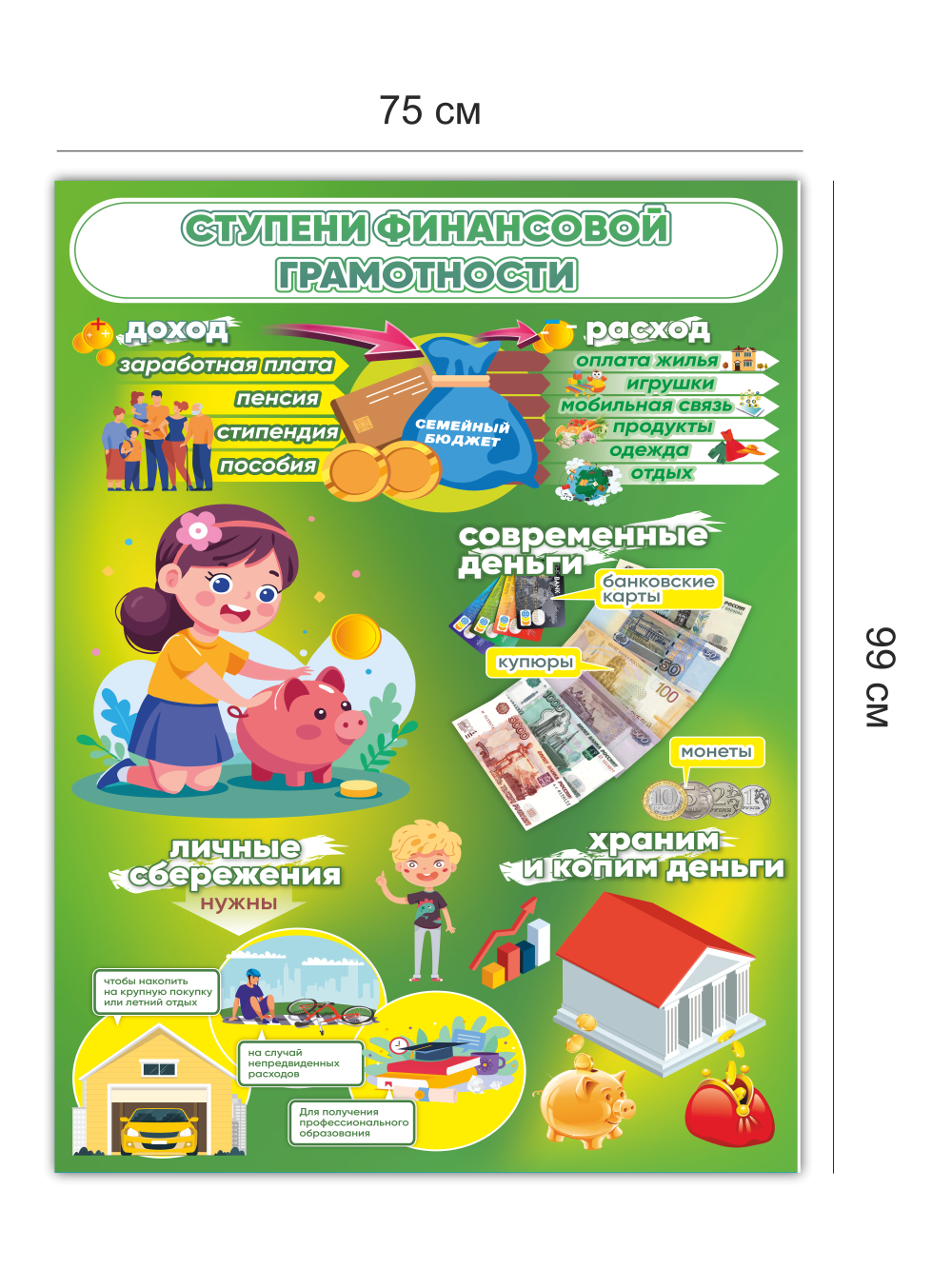 Яркий и познавательный стенд «Ступени финансовой грамотности» поможет детям в доступной форме понять основы обращения с деньгами. Материал наглядно показывает, из чего складывается доход, какие бывают расходы, зачем нужны сбережения и как правильно копить деньги.