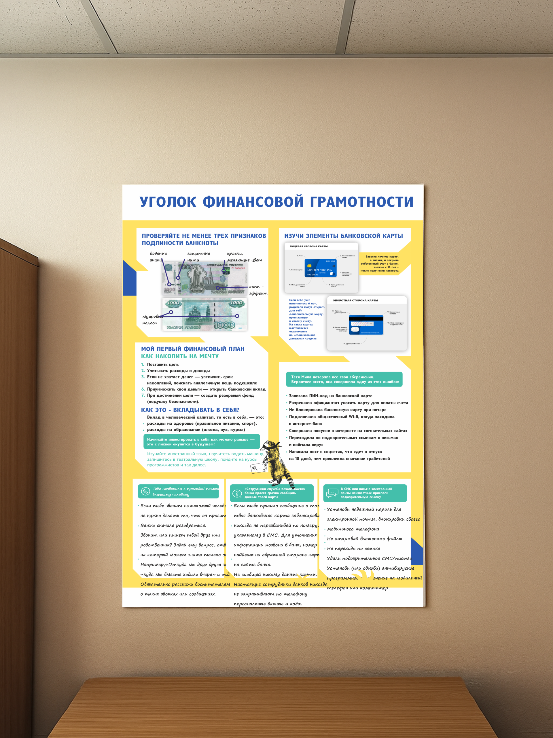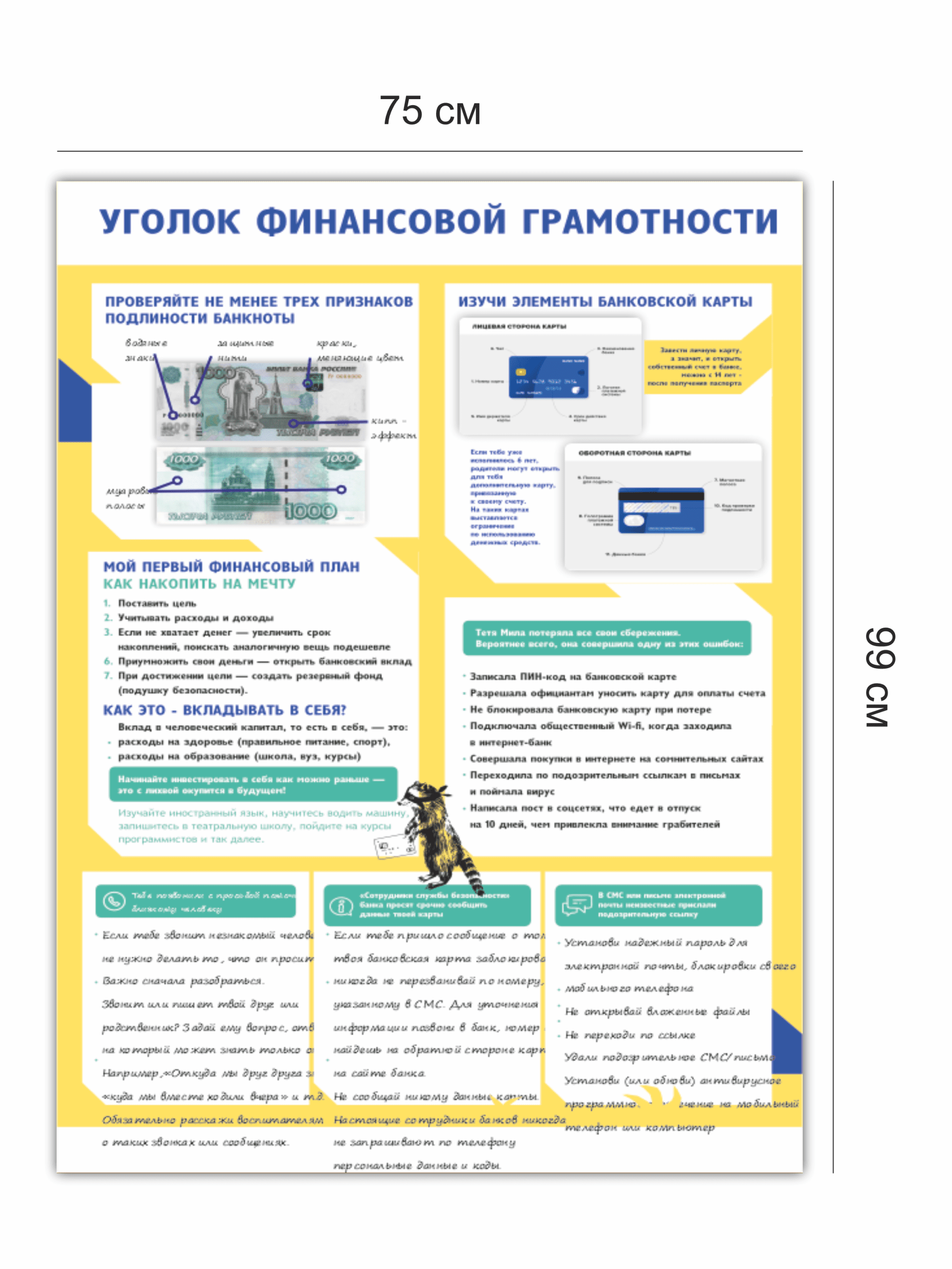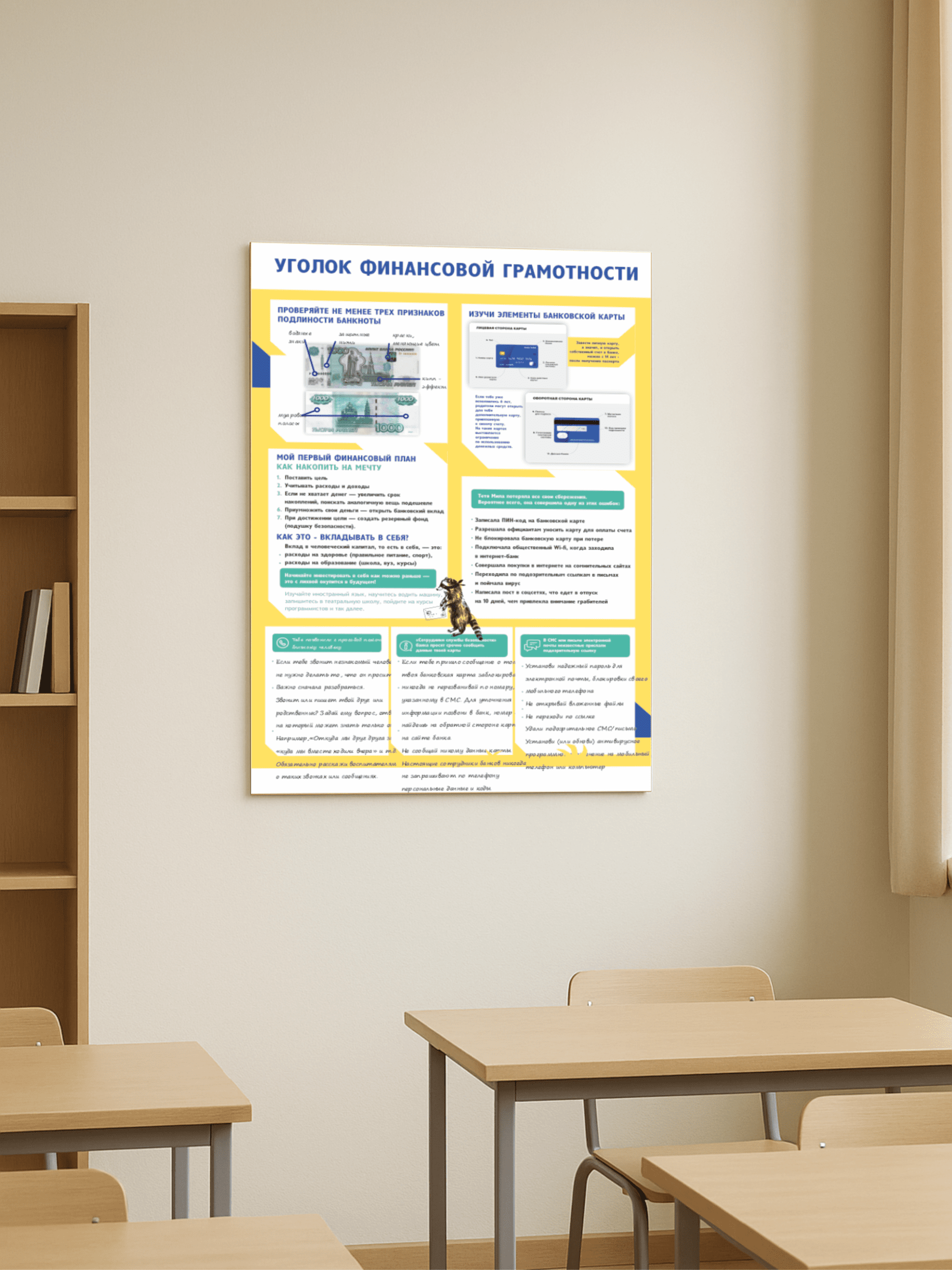 Познавательный стенд «Уголок финансовой грамотности» предназначен для наглядного обучения детей и подростков правилам обращения с деньгами. Яркий дизайн, чёткие схемы и иллюстрации помогают легко усвоить базовые финансовые понятия. Стенд выполнен из прочного ПВХ 3 мм с УФ-печатью и устанавливается на двустороннюю клейкую ленту.