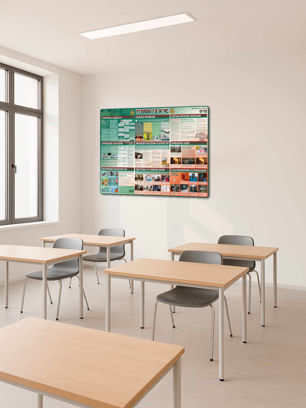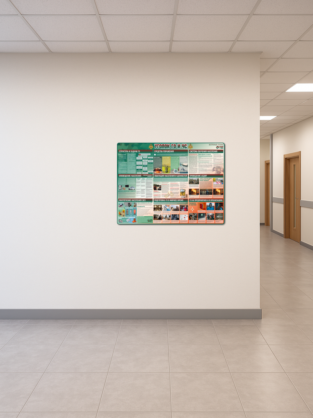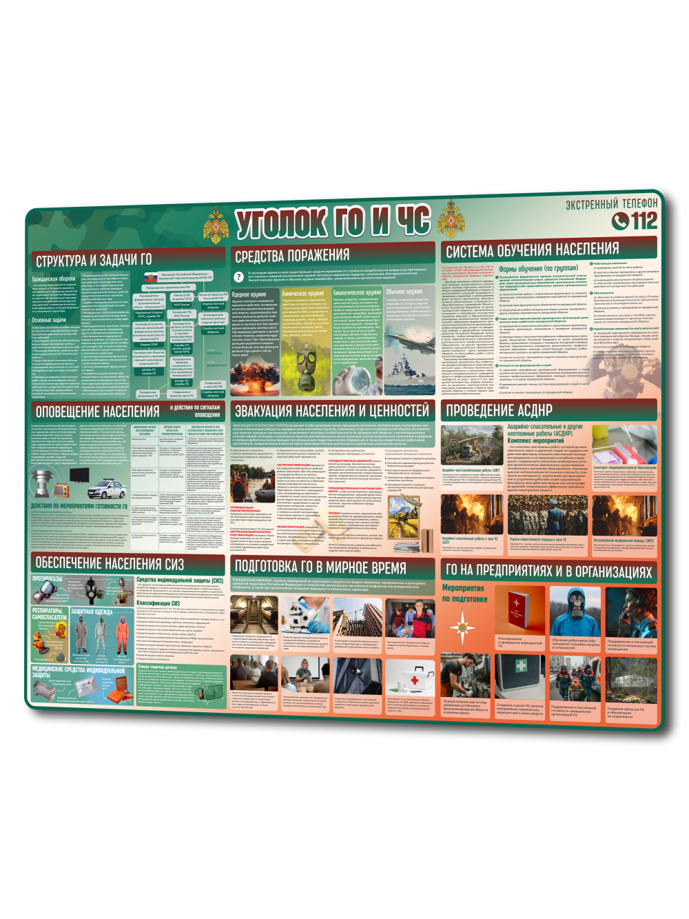 Стенд содержит полный комплекс материалов по ГО и ЧС: структуру и задачи гражданской обороны, способы оповещения, средства защиты, порядок эвакуации, обучение населения, проведение аварийно-спасательных работ и подготовку в мирное время. Подходит для школ, предприятий, офисов, государственных учреждений и любых организаций, где требуется размещение обязательной нормативной информации по ГО и ЧС.