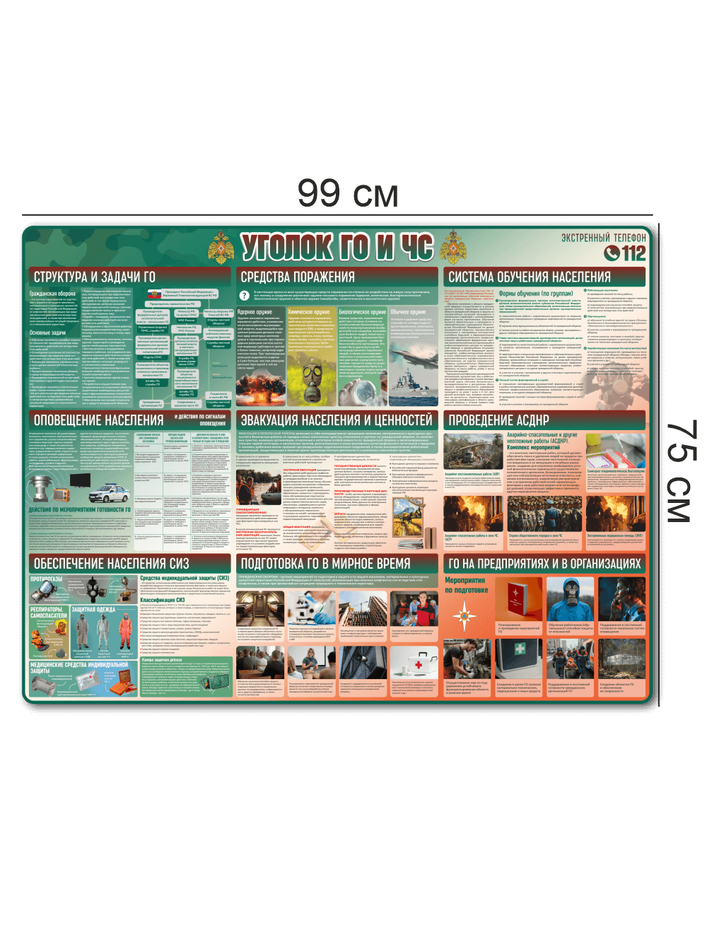 Стенд «Уголок ГО и ЧС» 99×75 см предназначен для оформления информационных зон по гражданской обороне и чрезвычайным ситуациям. Изготовлен из прочного ПВХ 3 мм с качественной УФ-печатью, устойчивой к выцветанию и механическому воздействию. На обороте установлена клейкая монтажная лента, позволяющая закрепить стенд без сверления.