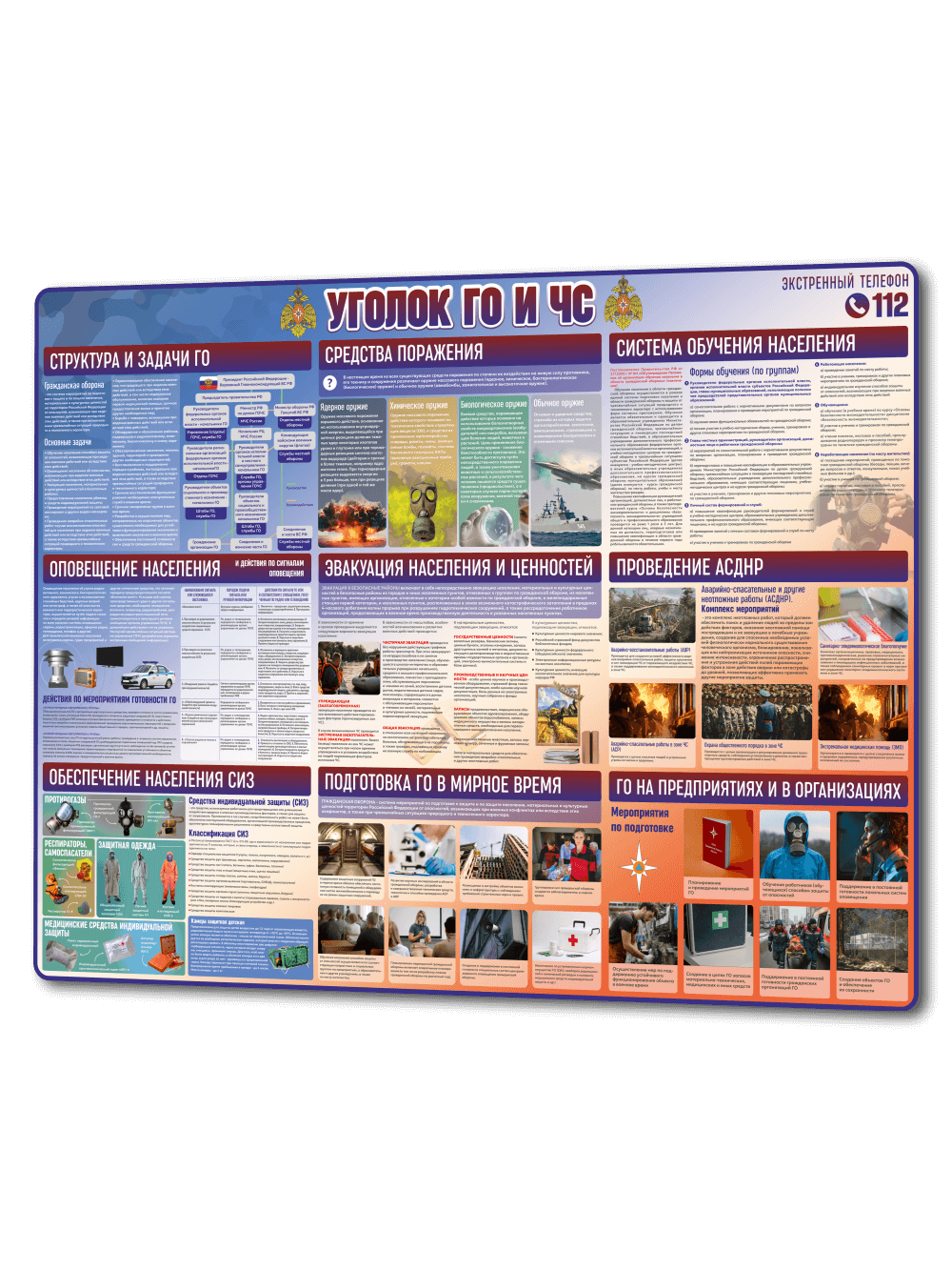 Стенд содержит полный комплекс материалов по ГО и ЧС: структуру и задачи гражданской обороны, способы оповещения, средства защиты, порядок эвакуации, обучение населения, проведение аварийно-спасательных работ и подготовку в мирное время. Подходит для школ, предприятий, офисов, государственных учреждений и любых организаций, где требуется размещение обязательной нормативной информации по ГО и ЧС.