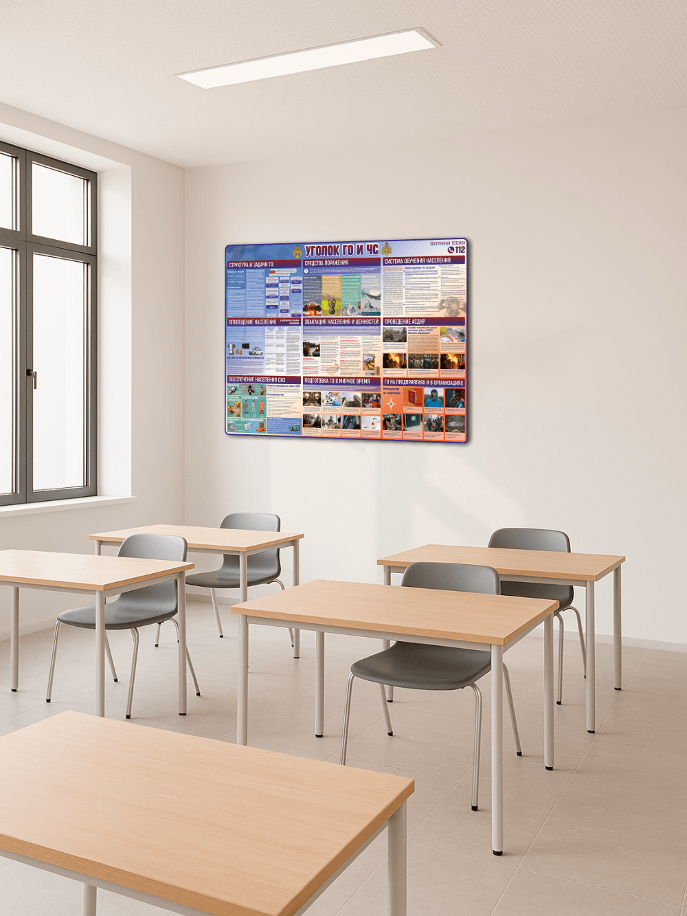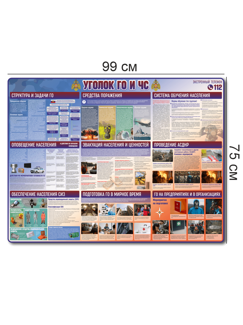 Стенд «Уголок ГО и ЧС» 99×75 см предназначен для оформления информационных зон по гражданской обороне и чрезвычайным ситуациям. Изготовлен из прочного ПВХ 3 мм с качественной УФ-печатью, устойчивой к выцветанию и механическому воздействию. На обороте установлена клейкая монтажная лента, позволяющая закрепить стенд без сверления.